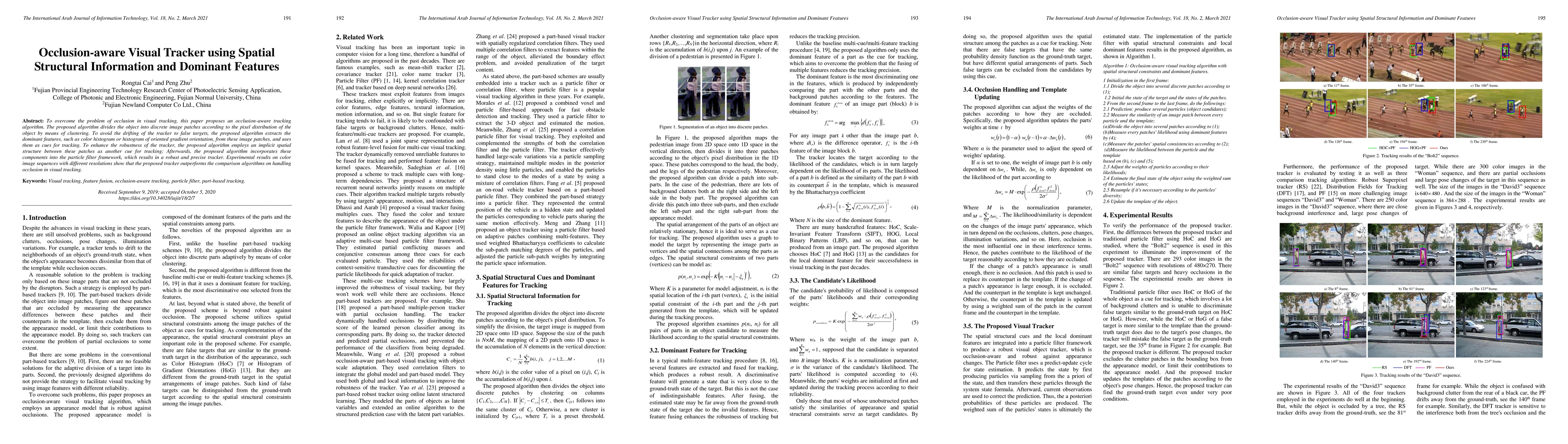 This paper proposes an occlusion-aware visual tracker that uses spatial structural information and dominant features to enhance tracking robustness. The algorithm clusters image patches based on pixel distribution and employs particle filtering to integrate spatial structure and feature cues for precise tracking, outperforming comparison methods in handling occlusion.