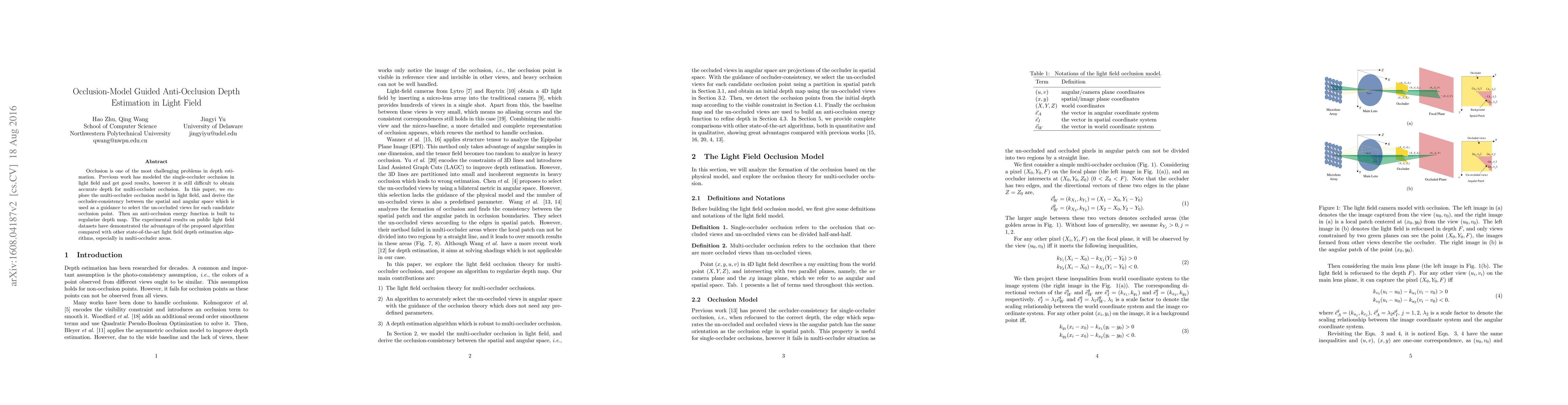 This paper proposes a method for accurate depth estimation in light fields, focusing on multi-occluder scenarios. It introduces an occlusion model and consistency guidance to select un-occluded views, followed by an anti-occlusion energy function to regularize the depth map, outperforming other algorithms in multi-occluder areas.