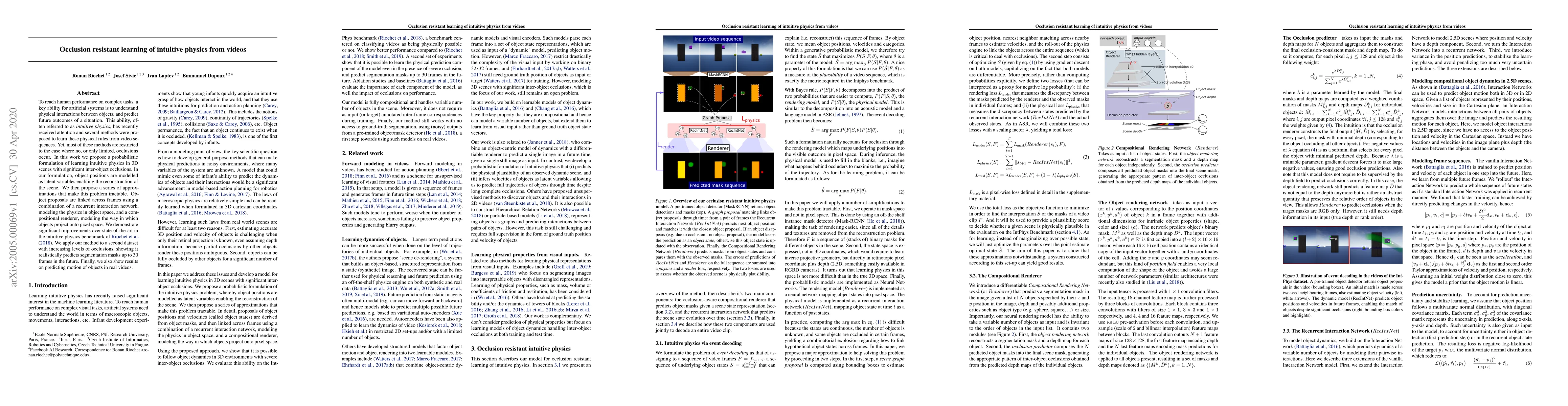 This paper proposes a probabilistic approach to learn intuitive physics from videos, focusing on handling significant inter-object occlusions. It introduces a recurrent interaction network and compositional renderer to model object positions and predict future outcomes, demonstrating improvements in the IntPhys benchmark and realistic predictions of object segmentation masks.