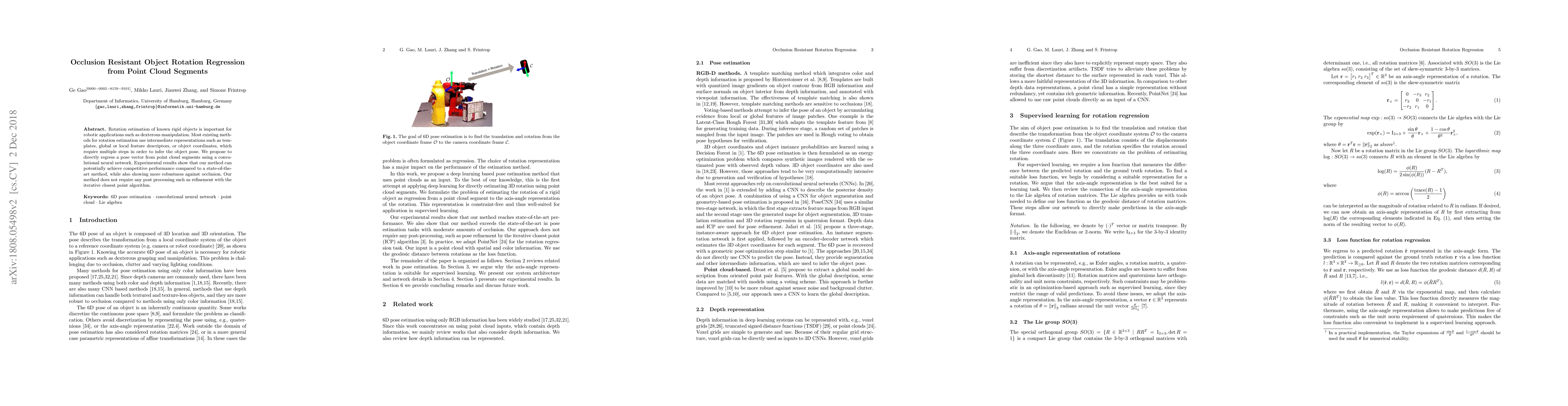 This paper proposes a direct regression method using convolutional neural networks to estimate the rotation of known rigid objects from raw point cloud segments, achieving competitive performance and robustness against occlusion compared to existing multi-step methods. The approach eliminates the need for post-processing refinement.