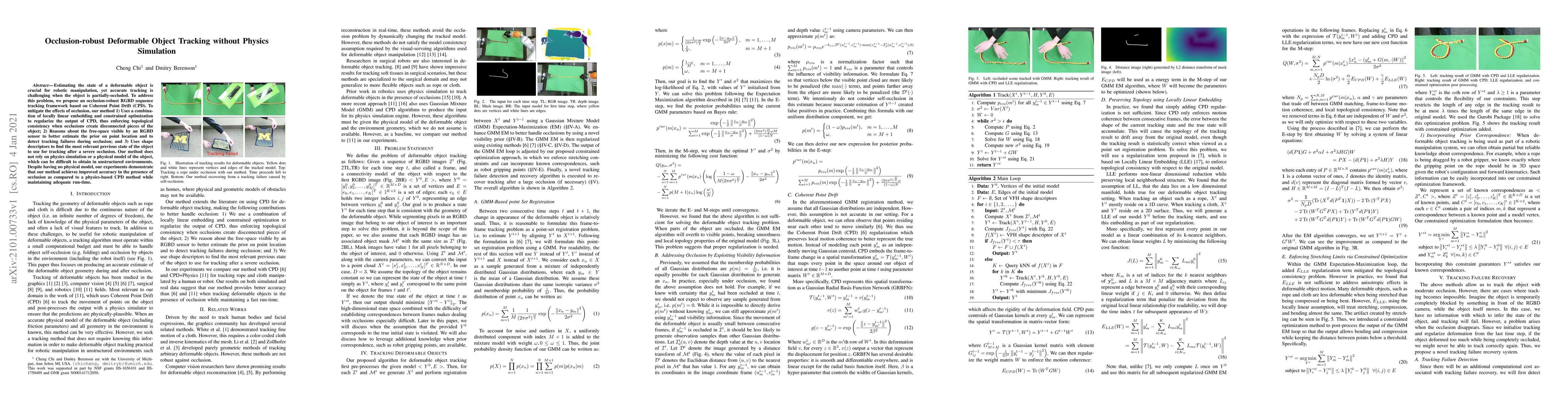 This paper proposes an occlusion-robust framework for tracking deformable objects in RGBD sequences using Coherent Point Drift (CPD), without relying on physics simulation. The method enhances tracking accuracy through regularization, free-space reasoning, and shape descriptors, achieving better performance under occlusion compared to physics-based approaches.