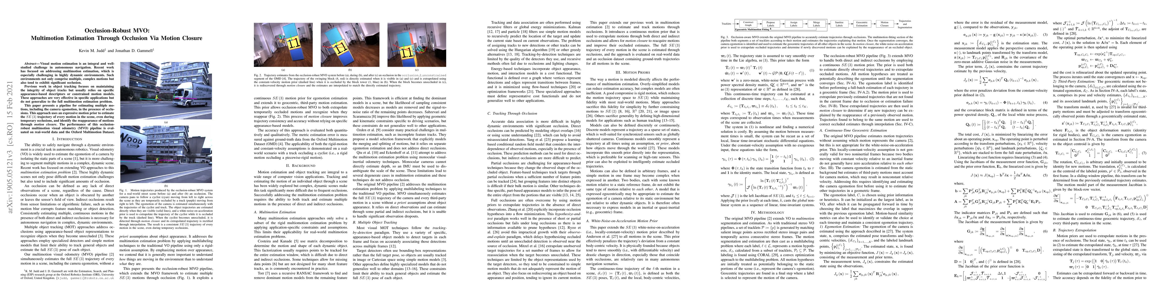 This paper proposes an occlusion-robust multimotion visual odometry (MVO) pipeline that estimates multiple motions, including camera egomotion, even in the presence of significant occlusions, using an expressive motion prior and motion closure techniques. The method is evaluated on real-world data and the Oxford Multimotion Dataset, demonstrating its effectiveness in dynamic environments.