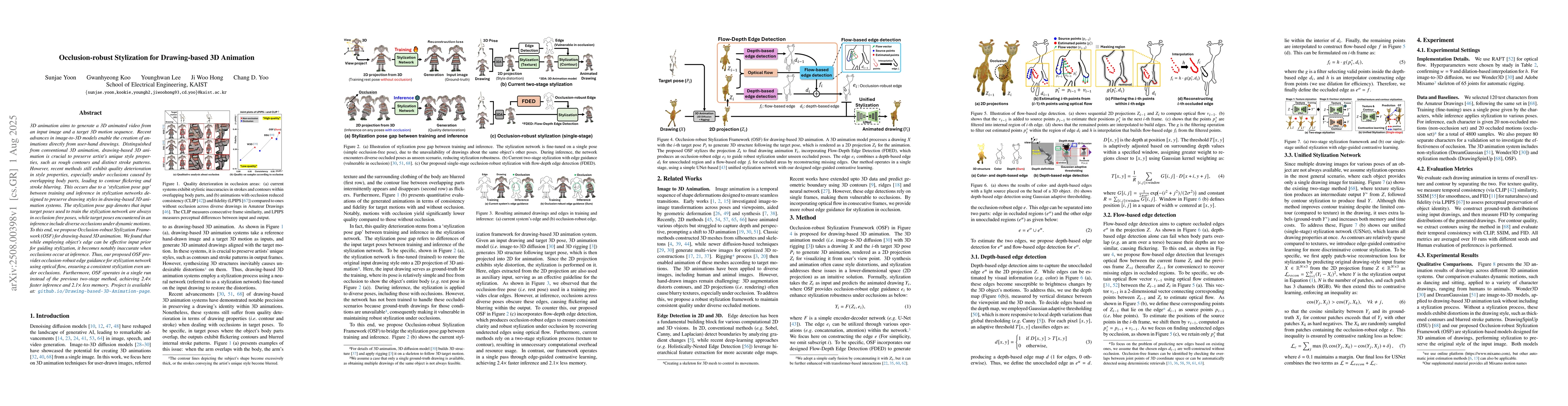 3D animation aims to generate a 3D animated video from an input image and a target 3D motion sequence. Recent advances in image-to-3D models enable the creation of animations directly from user-hand drawings. Distinguished from conventional 3D animation, drawing-based 3D animation is crucial to preserve artist's unique style properties, such as rough contours and distinct stroke patterns. However, recent methods still exhibit quality deterioration in style properties, especially under occlusions caused by overlapping body parts, leading to contour flickering and stroke blurring. This occurs due to a `stylization pose gap' between training and inference in stylization networks designed to preserve drawing styles in drawing-based 3D animation systems. The stylization pose gap denotes that input target poses used to train the stylization network are always in occlusion-free poses, while target poses encountered in an inference include diverse occlusions under dynamic motions. To this end, we propose Occlusion-robust Stylization Framework (OSF) for drawing-based 3D animation. We found that while employing object's edge can be effective input prior for guiding stylization, it becomes notably inaccurate when occlusions occur at inference. Thus, our proposed OSF provides occlusion-robust edge guidance for stylization network using optical flow, ensuring a consistent stylization even under occlusions. Furthermore, OSF operates in a single run instead of the previous two-stage method, achieving 2.4x faster inference and 2.1x less memory.
