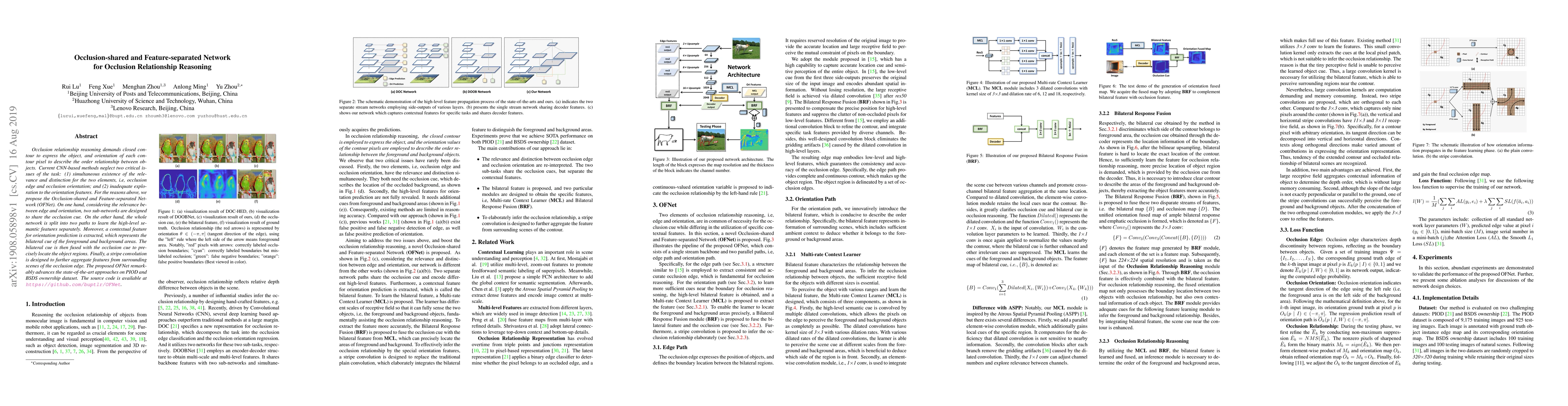 Occlusion relationship reasoning demands closed contour to express the object, and orientation of each contour pixel to describe the order relationship between objects. Current CNN-based methods neglect two critical issues of the task: (1) simultaneous existence of the relevance and distinction for the two elements, i.e, occlusion edge and occlusion orientation; and (2) inadequate exploration to the orientation features. For the reasons above, we propose the Occlusion-shared and Feature-separated Network (OFNet). On one hand, considering the relevance between edge and orientation, two sub-networks are designed to share the occlusion cue. On the other hand, the whole network is split into two paths to learn the high-level semantic features separately. Moreover, a contextual feature for orientation prediction is extracted, which represents the bilateral cue of the foreground and background areas. The bilateral cue is then fused with the occlusion cue to precisely locate the object regions. Finally, a stripe convolution is designed to further aggregate features from surrounding scenes of the occlusion edge. The proposed OFNet remarkably advances the state-of-the-art approaches on PIOD and BSDS ownership dataset. The source code is available at https://github.com/buptlr/OFNet.
