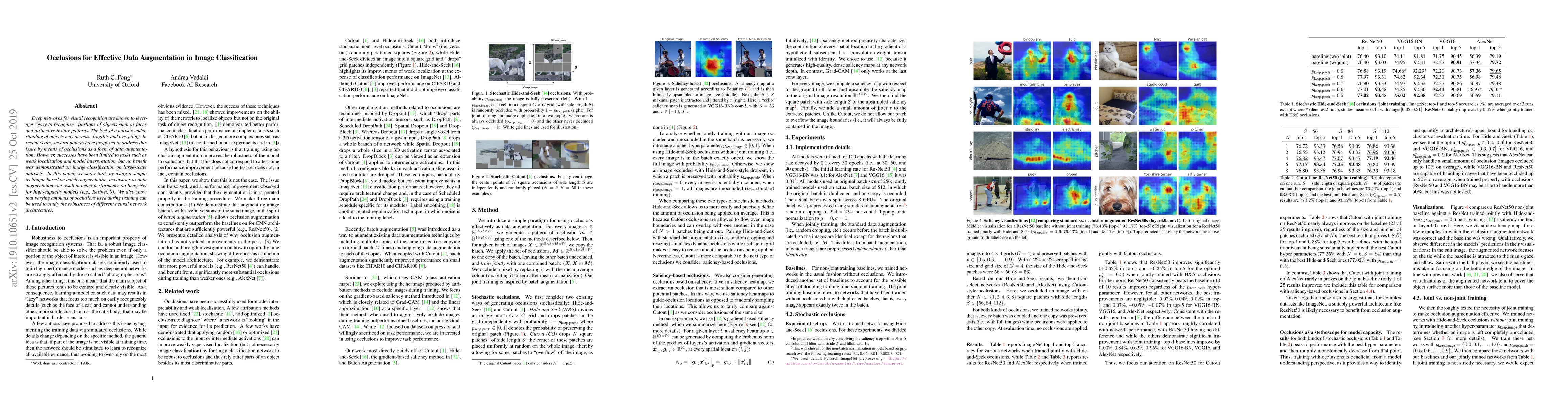 This paper demonstrates that incorporating occlusions through batch augmentation can significantly improve the performance of high-capacity models like ResNet50 on ImageNet for image classification. It also explores how varying occlusion levels during training can help assess the robustness of different neural network architectures.