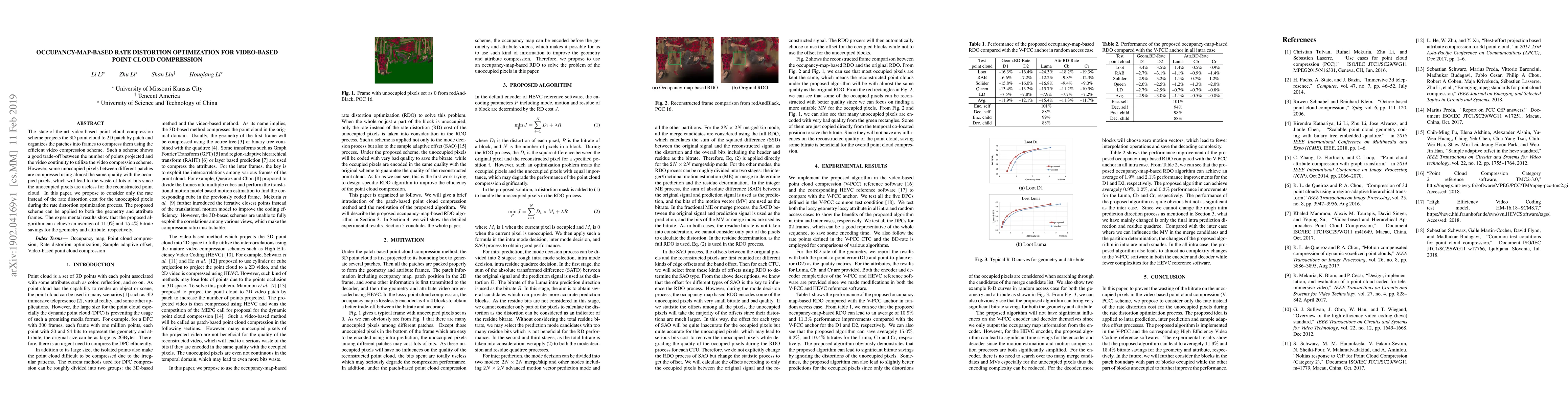This paper proposes an occupancy-map-based rate distortion optimization for video-based point cloud compression, focusing on reducing bitrate by optimizing only the rate for unoccupied pixels. The method achieves up to 11.9% and 15.4% bitrate savings for geometry and attribute frames, respectively.