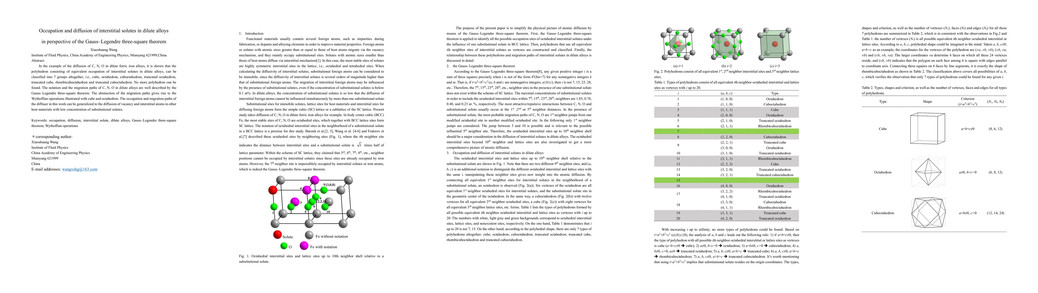 This research explores the diffusion of interstitial solutes (C, N, O) in dilute ferric iron alloys, classifying their polyhedral occupation into seven distinct groups using the Gauss Legendre three square theorem. The study generalizes these findings to other materials with low substitutional solute concentration.