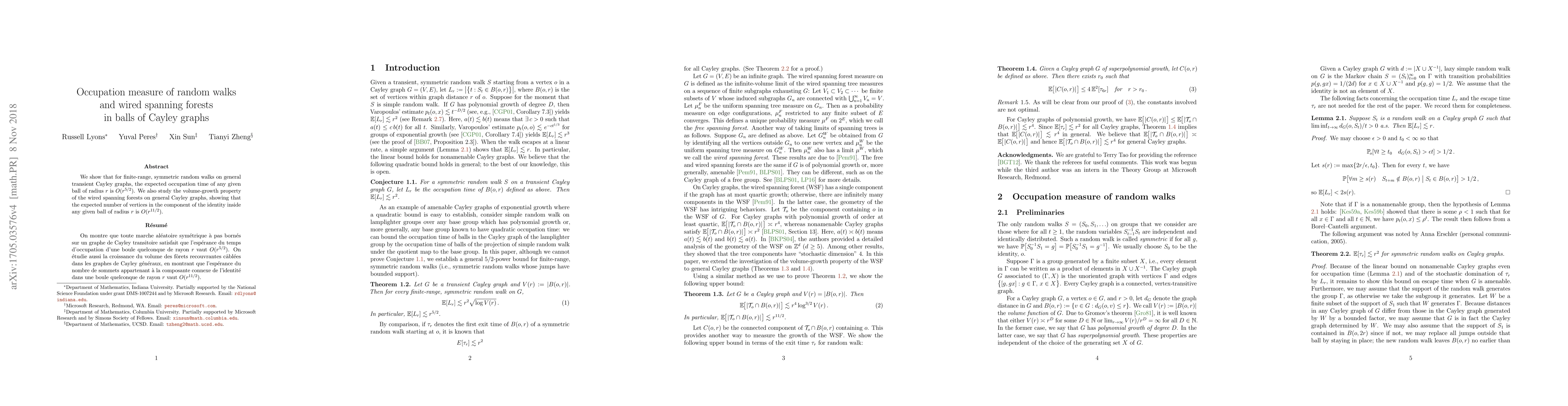 Summary: This paper demonstrates that the expected occupation time of random walks in balls of Cayley graphs scales as $O(r^{5/2})$, and it also investigates the volume-growth property of wired spanning forests, showing that the expected number of vertices in the component of the identity scales as $O(r^{11/2})$.