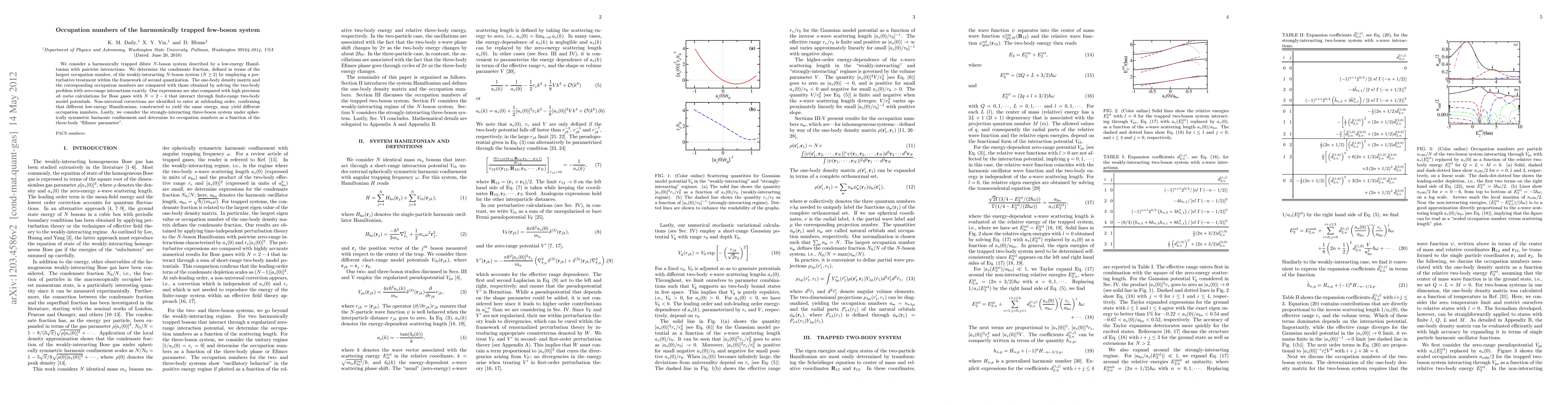 We consider a harmonically trapped dilute $N$-boson system described by a low-energy Hamiltonian with pairwise interactions. We determine the condensate fraction, defined in terms of the largest occupation number, of the weakly-interacting $N$-boson system ($N \ge 2$) by employing a perturbative treatment within the framework of second quantization. The one-body density matrix and the corresponding occupation numbers are compared with those obtained by solving the two-body problem with zero-range interactions exactly. Our expressions are also compared with high precision {\em{ab initio}} calculations for Bose gases with $N=2-4$ that interact through finite-range two-body model potentials. Non-universal corrections are identified to enter at subleading order, confirming that different low-energy Hamiltonians, constructed to yield the same energy, may yield different occupation numbers. Lastly, we consider the strongly-interacting three-boson system under spherically symmetric harmonic confinement and determine its occupation numbers as a function of the three-body "Efimov parameter".