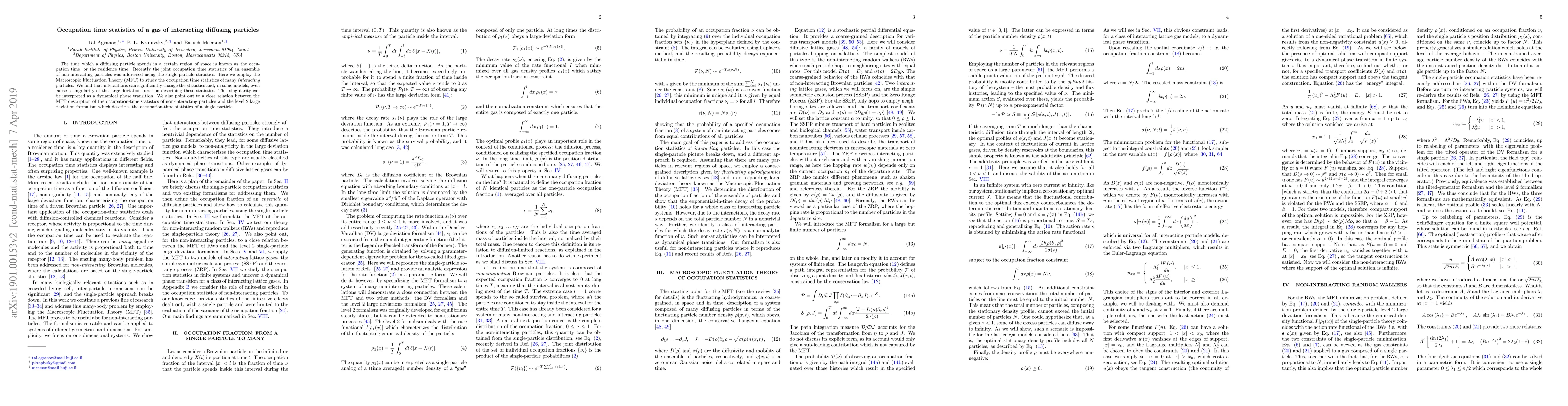 This paper uses Macroscopic Fluctuation Theory to investigate the occupation time statistics of interacting diffusing particles, finding that interactions can significantly alter the statistics and potentially cause singularities in the large-deviation function, indicating a dynamical phase transition. It also highlights a connection between the MFT for non-interacting particles and the level 2 large deviation formalism for single-particle statistics.