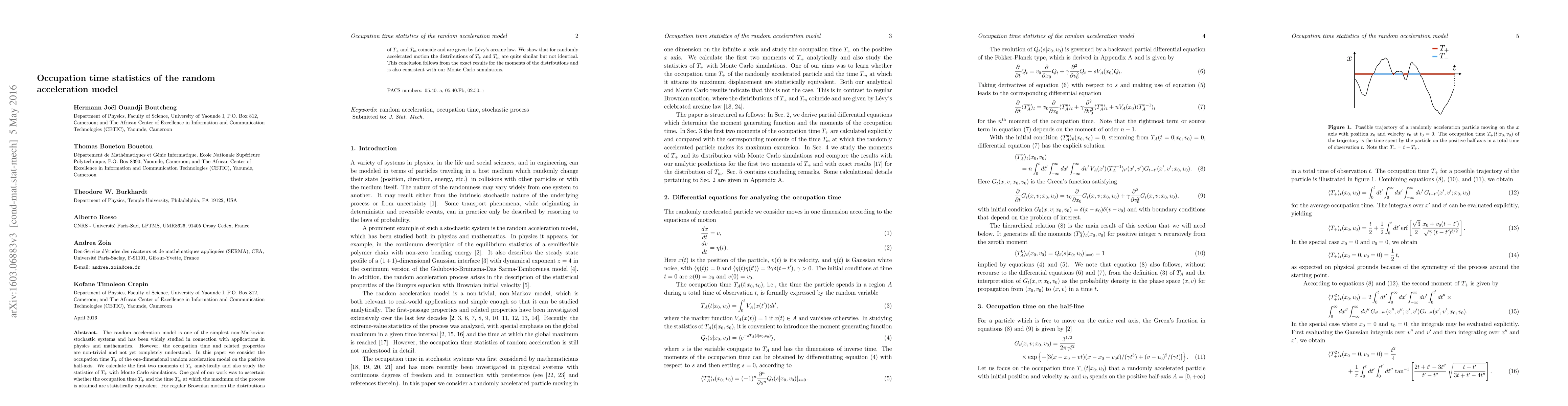 This paper investigates the occupation time $T_+$ of the one-dimensional random acceleration model on the positive half-axis, calculating its first two moments and comparing its statistical properties to the time $T_m$ when the maximum is reached. It finds that while the distributions of $T_+$ and $T_m$ are similar, they are not identical, unlike in regular Brownian motion.