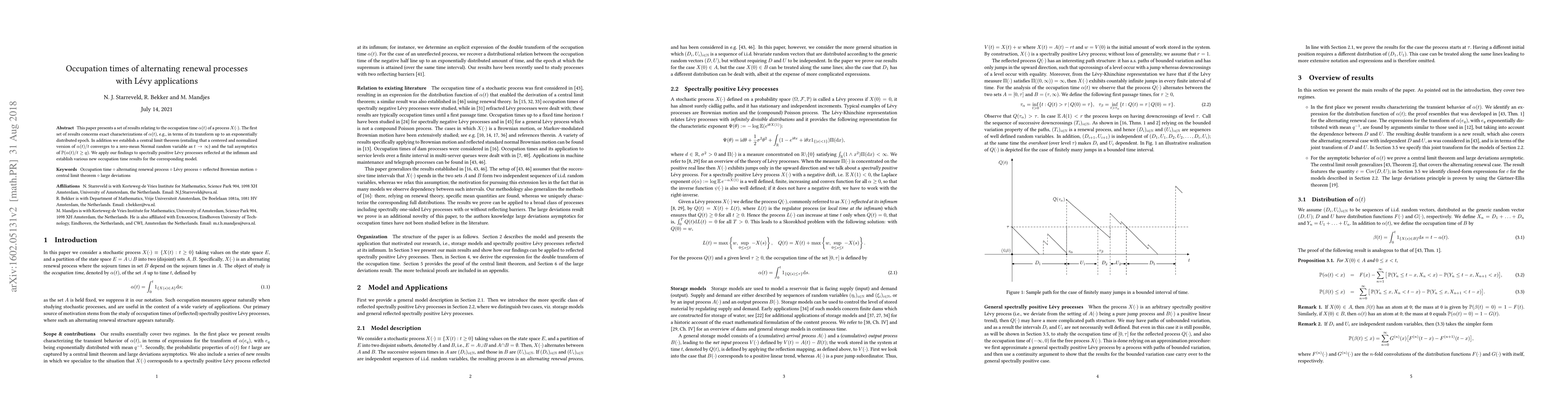 This paper characterizes occupation times of alternating renewal processes for spectrally positive Lévy processes, establishing a central limit theorem and tail asymptotics, with implications for modeling and analysis.
