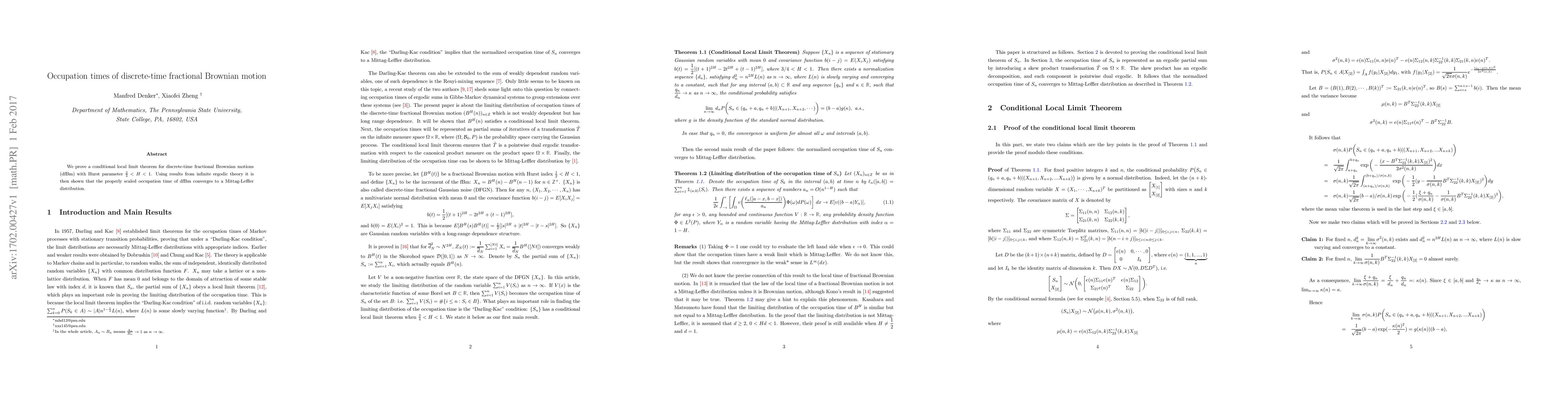 Researchers proved a conditional local limit theorem for discrete-time fractional Brownian motion, showing its occupation time converges to a Mittag-Leffler distribution at Hurst parameters between 3/4 and 1.