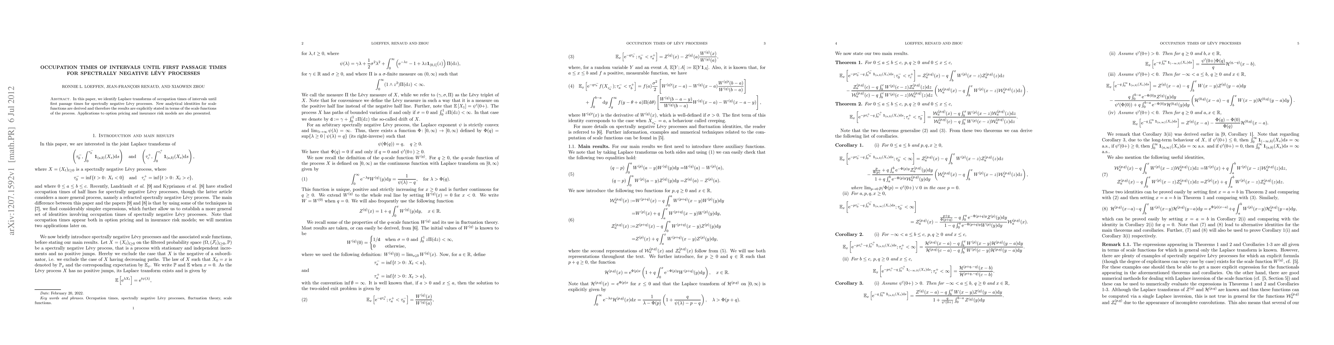 This paper derives Laplace transforms for occupation times of intervals until first passage times in spectrally negative Lévy processes, establishing new analytical identities for scale functions. Applications to option pricing and insurance risk models are also discussed.