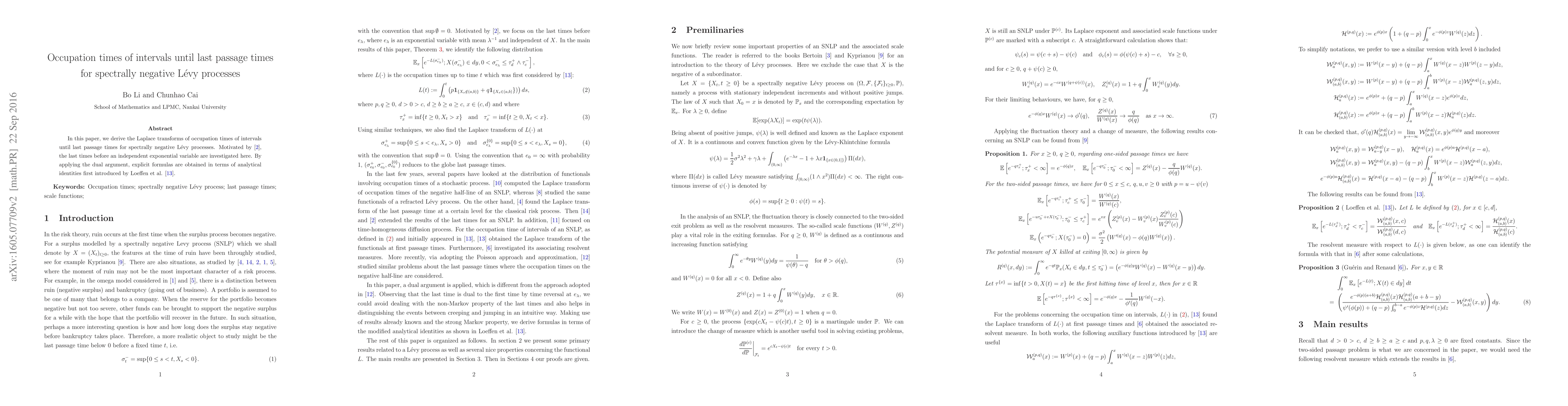 In this paper, we derive the joint Laplace transforms of occupation times until its last passage times as well as its positions. Motivated by Baurdoux [2], the last times before an independent exponential variable are studied. By applying dual arguments, explicit formulas are derived in terms of new analytical identities from Loeffen et al. [12].