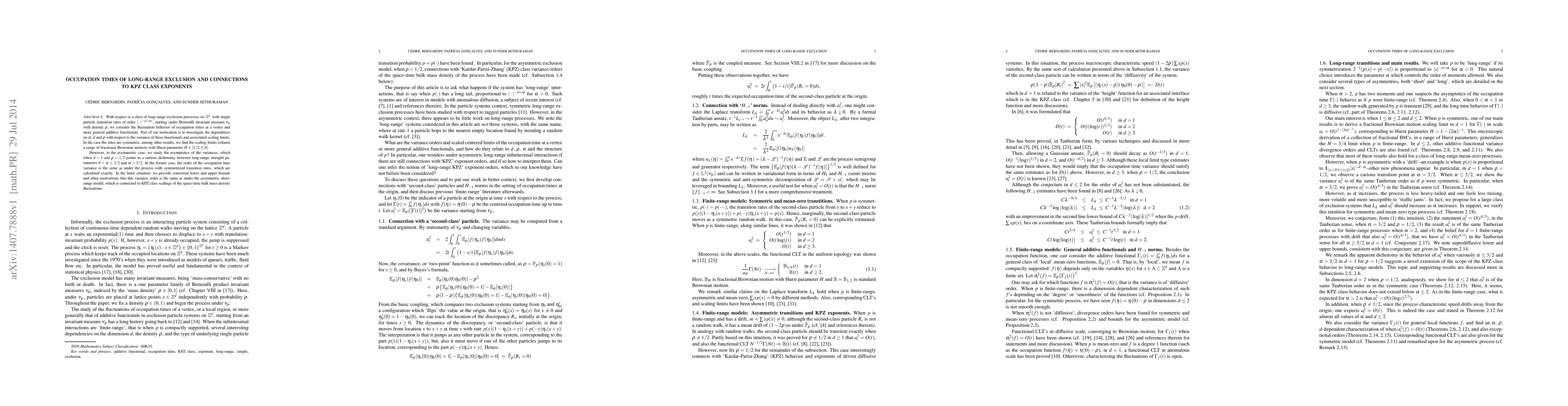 With respect to a class of long-range exclusion processes on $\mathbb{Z}^d$, with single particle transition rates of order $|\cdot|^{-(d+\alpha)}$, starting under Bernoulli invariant measure $\nu_\rho$ with density $\rho$, we consider the fluctuation behavior of occupation times at a vertex and more general additive functionals. Part of our motivation is to investigate the dependence on $\alpha$, $d$ and $\rho$ with respect to the variance of these functionals and associated scaling limits. In the case the rates are symmetric, among other results, we find the scaling limits exhaust a range of fractional Brownian motions with Hurst parameter $H\in [1/2,3/4]$. However, in the asymmetric case, we study the asymptotics of the variances, which when $d=1$ and $\rho=1/2$ points to a curious dichotomy between long-range strength parameters $0<\alpha\leq 3/2$ and $\alpha>3/2$. In the former case, the order of the occupation time variance is the same as under the process with symmetrized transition rates, which are calculated exactly. In the latter situation, we provide consistent lower and upper bounds and other motivations that this variance order is the same as under the asymmetric short-range model, which is connected to KPZ class scalings of the space-time bulk mass density fluctuations.