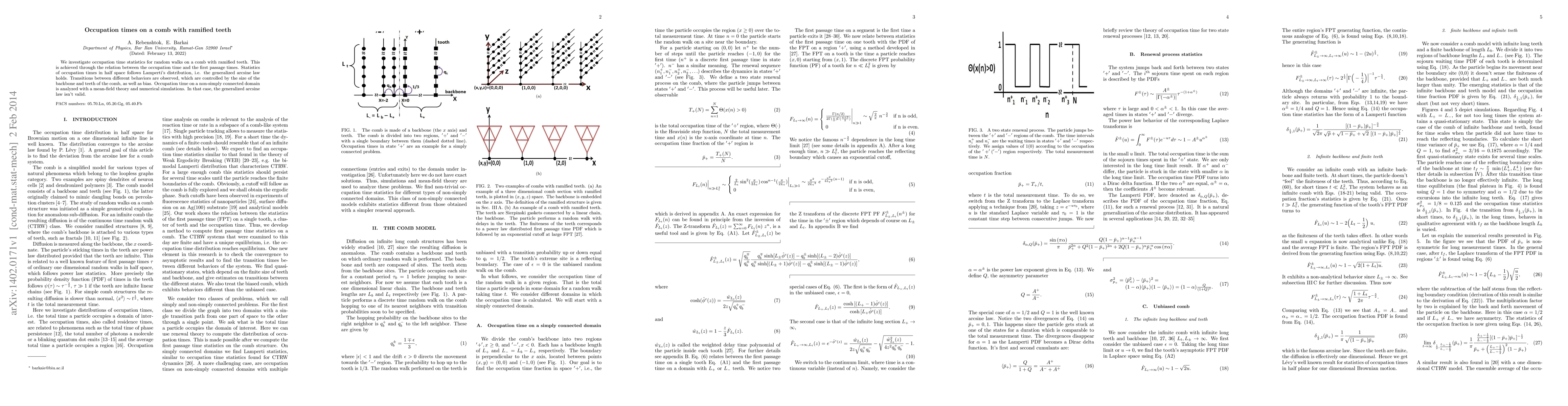 This paper examines the occupation time statistics for random walks on a comb structure with branched teeth, revealing that the generalized arcsine law applies in half-space but not in non-simply connected domains. Transitions in behavior are influenced by the comb's geometry and bias, analyzed using mean-field theory and numerical simulations.