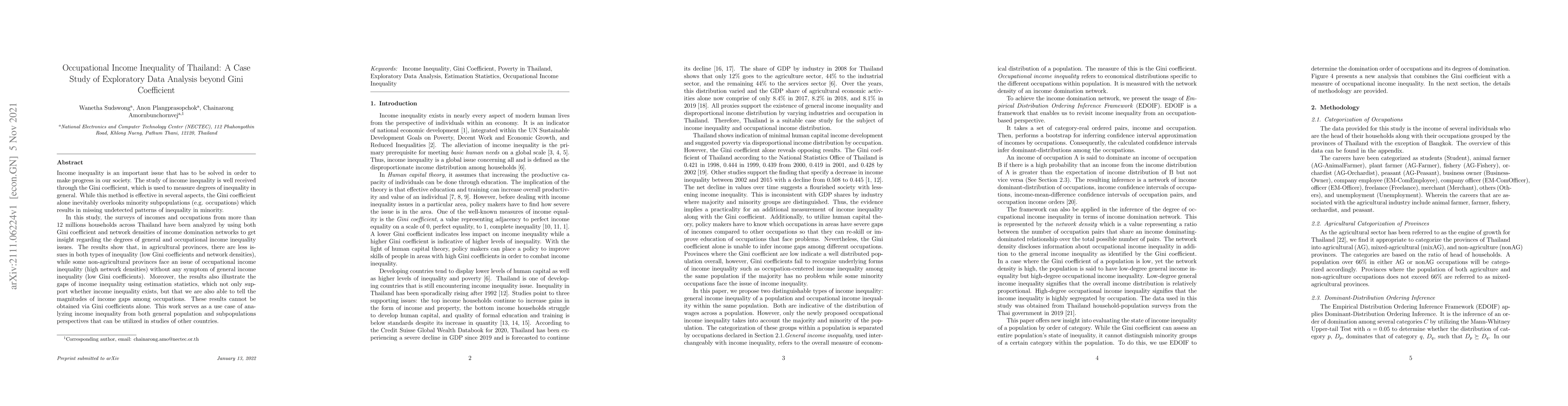 This study explores income inequality in Thailand using both Gini coefficients and income domination network analysis, revealing that non-agricultural provinces face occupational income inequality without general income inequality. The findings highlight the importance of examining subpopulations beyond the Gini coefficient to detect nuanced patterns of inequality.