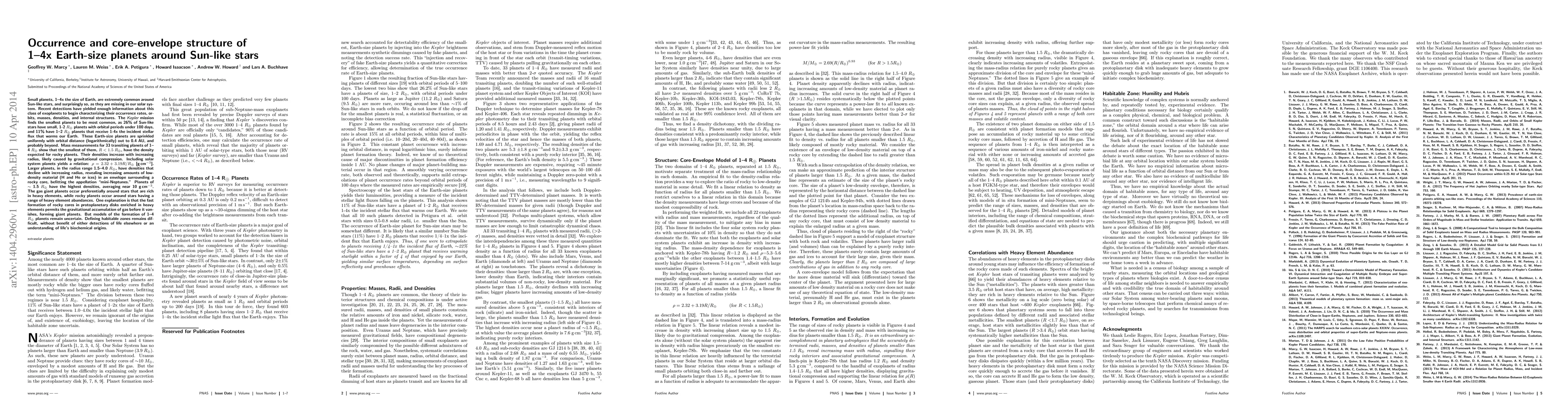 The Kepler mission reveals that small, Earth-size planets (1-4x Earth's radius) are prevalent around Sun-like stars, with 26% hosting planets with radii <2 R_e and orbital periods <100 days. These planets exhibit varying densities, with smaller ones (<1.5 R_e) likely rocky and larger ones (>1.5 R_e) having lower densities due to gas envelopes, termed "mini-Neptunes."