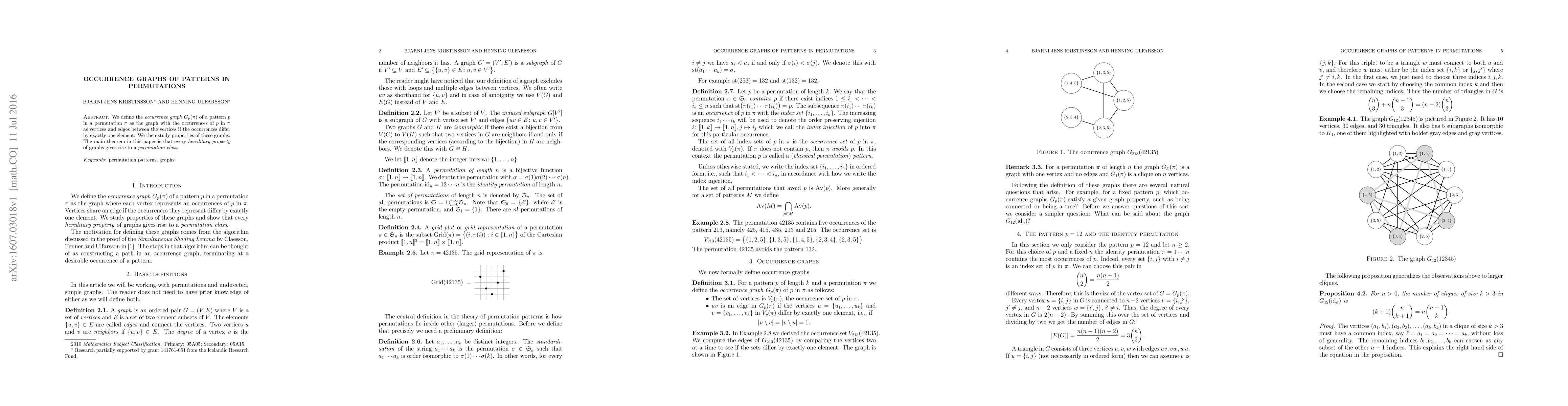 We define the \emph{occurrence graph} $G_p(\pi$) of a pattern $p$ in a permutation $\pi$ as the graph with the occurrences of $p$ in $\pi$ as vertices and edges between the vertices if the occurrences differ by exactly one element. We then study properties of these graphs. The main theorem in this paper is that every \emph{hereditary property} of graphs gives rise to a \emph{permutation class}.