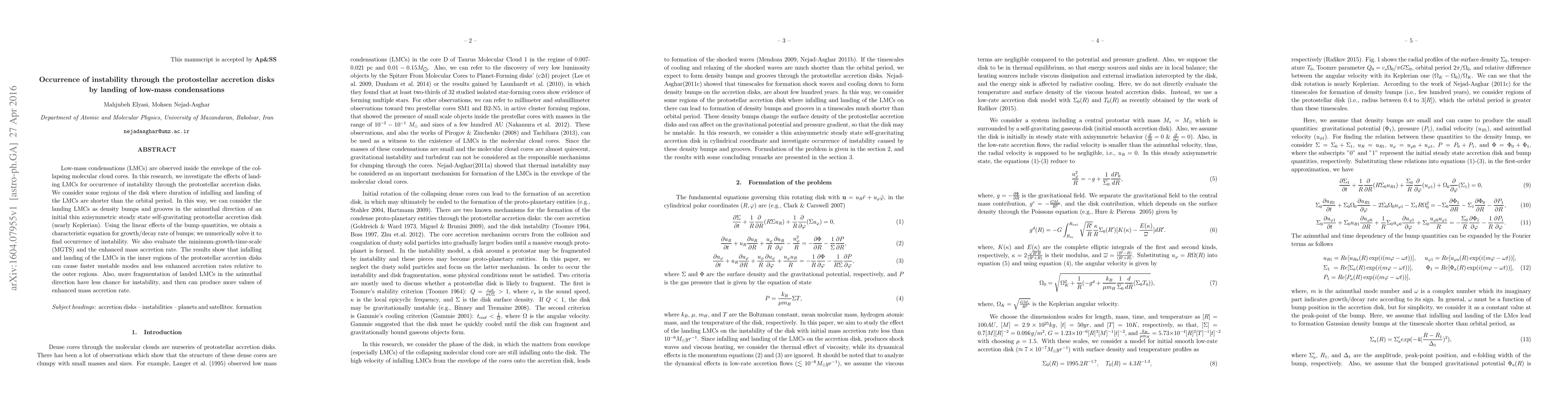 This paper investigates how low-mass condensations (LMCs) landing in protostellar accretion disks can induce instability. Numerical solutions reveal that LMCs in the inner disk regions cause faster unstable modes and lower enhanced accretion rates, while fragmentation in the azimuthal direction leads to higher accretion rates.