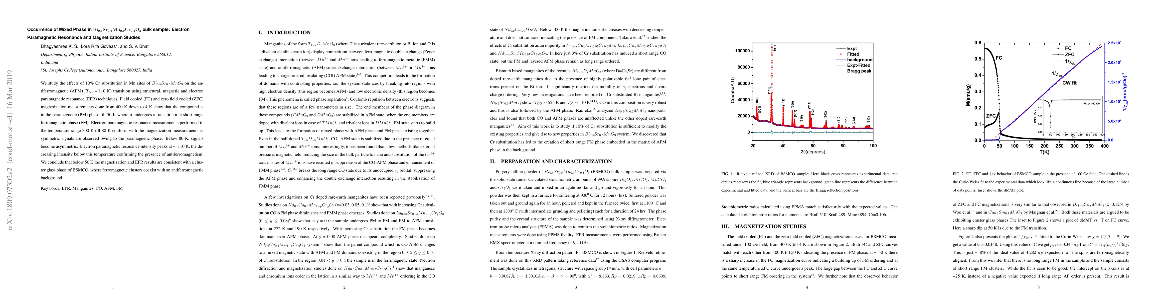We study the effects of 10% Cr substitution in Mn sites of Bi0.5Sr0.5MnO3 on the antiferromagnetic (AFM) (TN ~ 110 K) transition using structural, magnetic and electron paramagnetic resonance (EPR) techniques. Field cooled (FC) and zero field cooled (ZFC) magnetization measurements done from 400 K down to 4 K show that the compound is in the paramagnetic (PM) phase till 50 K where it undergoes a transition to a short range ferromagnetic phase (FM). Electron paramagnetic resonance measurements performed in the temperature range 300 K till 80 K conform with the magnetization measurements as symmetric signals are observed owing to the paramagnetic phase. Below 80 K, signals become asymmetric. Electron paramagnetic resonance intensity peaks at ~ 110 K, the decreasing intensity below this temperature confirming the presence of antiferromagnetism. We conclude that below 50 K the magnetization and EPR results are consistent with a cluster glass phase of BSMCO, where ferromagnetic clusters coexist with an antiferromagnetic background.