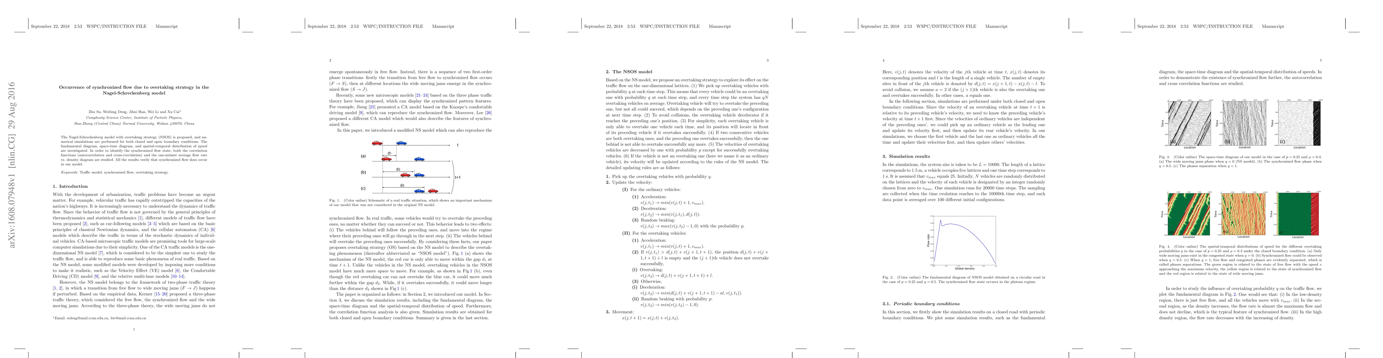 The Nagel-Schreckenberg model with overtaking strategy (NSOS) demonstrates synchronized flow through numerical simulations under both closed and open boundary conditions, confirmed by correlation functions and flow rate vs. density diagrams. Synchronized flow is identified as a valid state in this model.