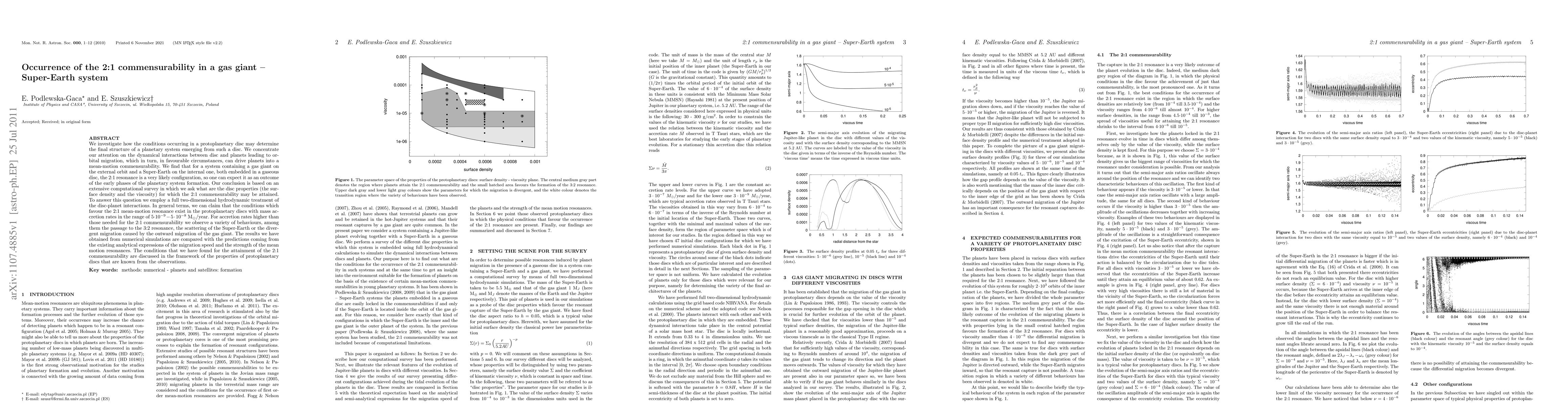 We investigate how the conditions occurring in a protoplanetary disc may determine the final structure of a planetary system emerging from such a disc. We concentrate our attention on the dynamical interactions between disc and planets leading to orbital migration, which in turn, in favourable circumstances, can drive planets into a mean-motion commensurability. We find that for a system containing a gas giant on the external orbit and a Super-Earth on the internal one, both embedded in a gaseous disc, the 2:1 resonance is a very likely configuration, so one can expect it as an outcome of the early phases of the planetary system formation. Our conclusion is based on an extensive computational survey in which we ask what are the disc properties (the surface density and the viscosity) for which the 2:1 commensurability may be attained. To answer this question we employ a full two-dimensional hydrodynamic treatment of the disc-planet interactions. In general terms, we can claim that the conditions which favour the 2:1 mean-motion resonance exist in the protoplanetary discs with mass accretion rates typical for slowly accreting T Tauri stars. For accretion rates higher than those needed for the 2:1 commensurability we observe a variety of behaviours, among them the passage to the 3:2 resonance, the scattering of the Super-Earth or the divergent migration caused by the outward migration of the gas giant. The results we have obtained from numerical simulations are compared with the predictions coming from the existing analytical expressions of the migration speed and the strength of the mean motion resonances. The conditions that we have found for the attainment of the 2:1 commensurability are discussed in the framework of the properties of protoplanetary discs that are known from the observations.