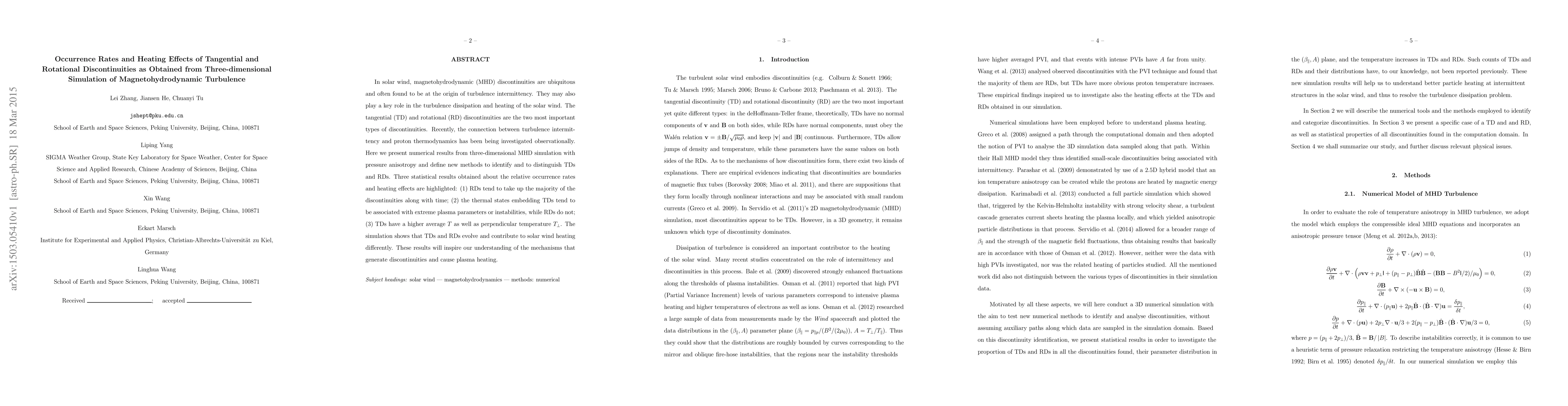 This paper investigates the occurrence rates and heating effects of tangential and rotational discontinuities in solar wind using three-dimensional MHD simulations. It finds that rotational discontinuities dominate over time, tangential discontinuities have higher average temperatures, and both types contribute differently to solar wind heating.