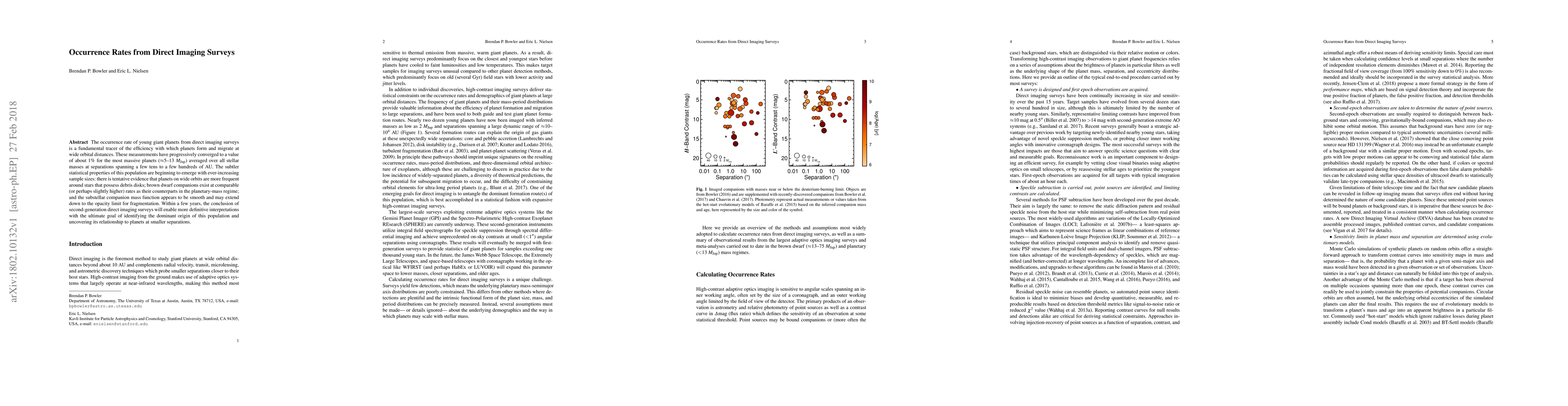 The occurrence rate of young giant planets from direct imaging surveys is a fundamental tracer of the efficiency with which planets form and migrate at wide orbital distances. These measurements have progressively converged to a value of about 1% for the most massive planets ($\approx$5-13 $M_\mathrm{Jup}$) averaged over all stellar masses at separations spanning a few tens to a few hundreds of AU. The subtler statistical properties of this population are beginning to emerge with ever-increasing sample sizes: there is tentative evidence that planets on wide orbits are more frequent around stars that possess debris disks; brown dwarf companions exist at comparable (or perhaps slightly higher) rates as their counterparts in the planetary-mass regime; and the substellar companion mass function appears to be smooth and may extend down to the opacity limit for fragmentation. Within a few years, the conclusion of second-generation direct imaging surveys will enable more definitive interpretations with the ultimate goal of identifying the dominant origin of this population and uncovering its relationship to planets at smaller separations.