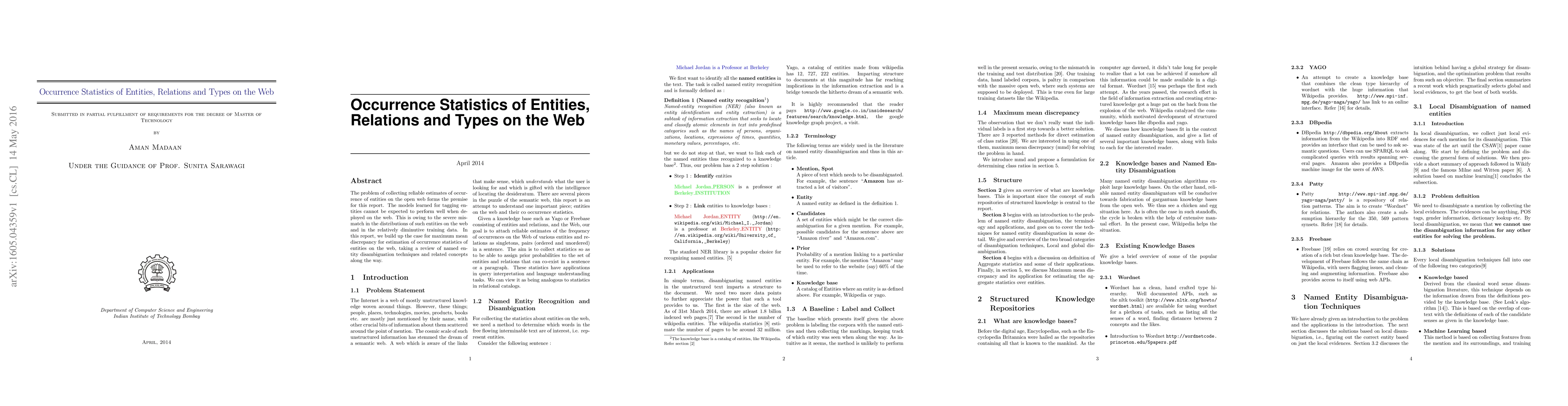 The problem of collecting reliable estimates of occurrence of entities on the open web forms the premise for this report. The models learned for tagging entities cannot be expected to perform well when deployed on the web. This is owing to the severe mismatch in the distributions of such entities on the web and in the relatively diminutive training data. In this report, we build up the case for maximum mean discrepancy for estimation of occurrence statistics of entities on the web, taking a review of named entity disambiguation techniques and related concepts along the way.