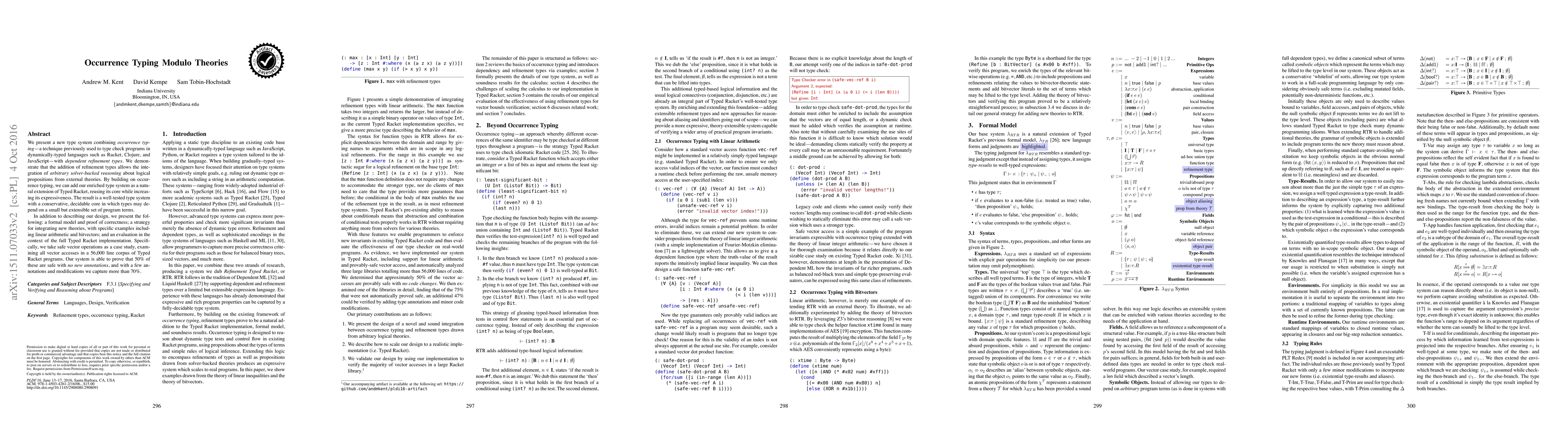 This paper introduces a new type system that combines occurrence typing with dependent refinement types, enhancing Typed Racket's expressiveness. It integrates logical propositions from external theories, enabling rich type relationships and safe vector access verification in a 56,000 line corpus, proving 50% safe accesses without new annotations and nearly 80% with minor modifications.