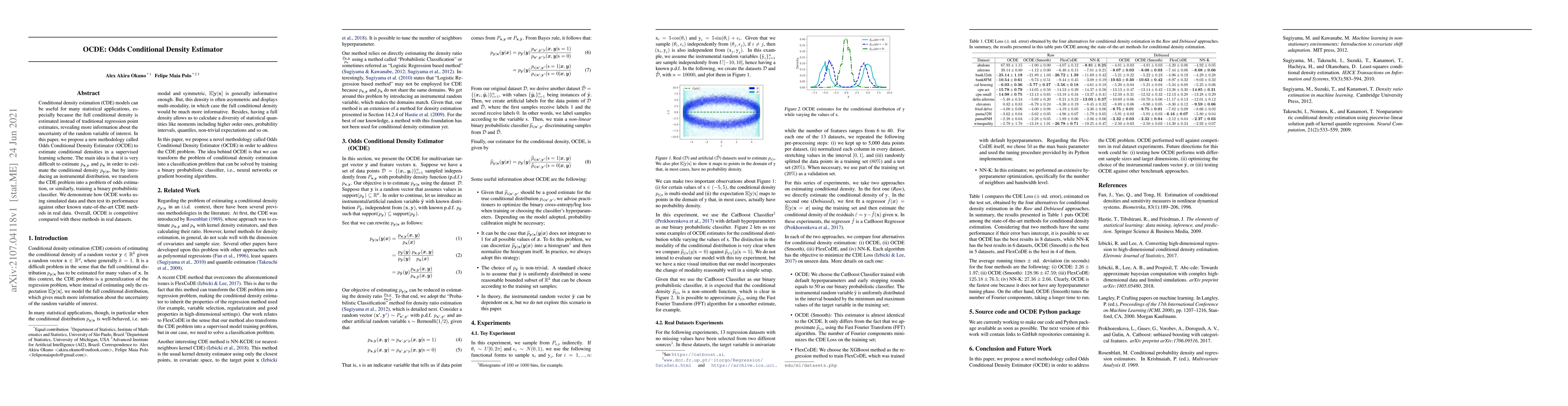 The paper introduces the Odds Conditional Density Estimator (OCDE), a novel method for estimating conditional densities in a supervised learning scheme. OCDE transforms the challenging CDE problem into odds estimation using an instrumental distribution, demonstrating competitive performance against other state-of-the-art CDE methods in both simulated and real-world datasets.