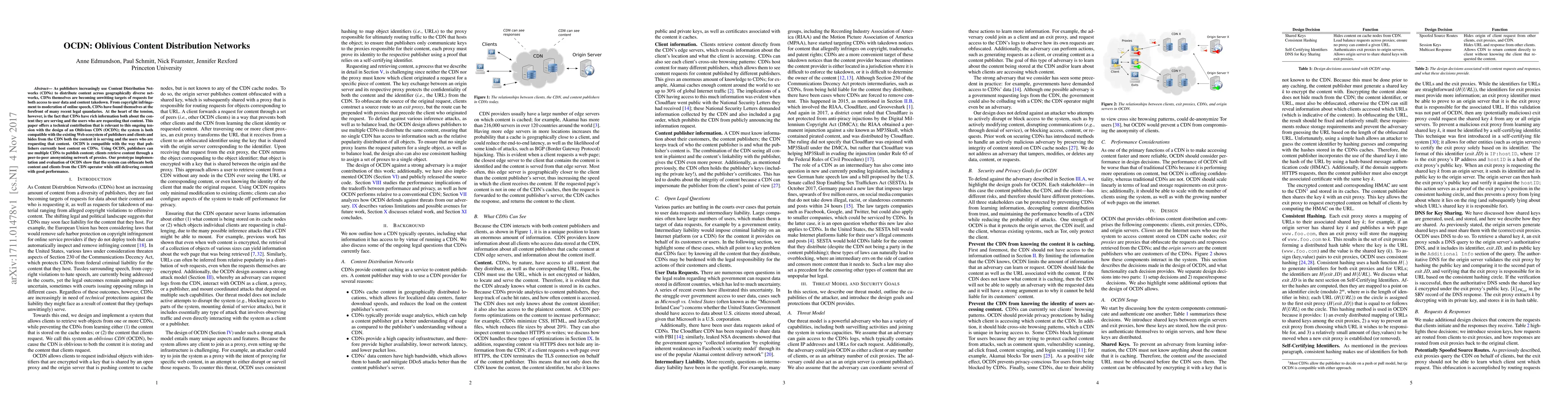 This paper introduces OCDN, an Oblivious Content Distribution Network designed to protect both content and user privacy by hiding this information from CDN operators, thereby addressing legal and privacy concerns in content distribution. The system maintains compatibility with existing web infrastructure and demonstrates effective performance in prototype evaluations.