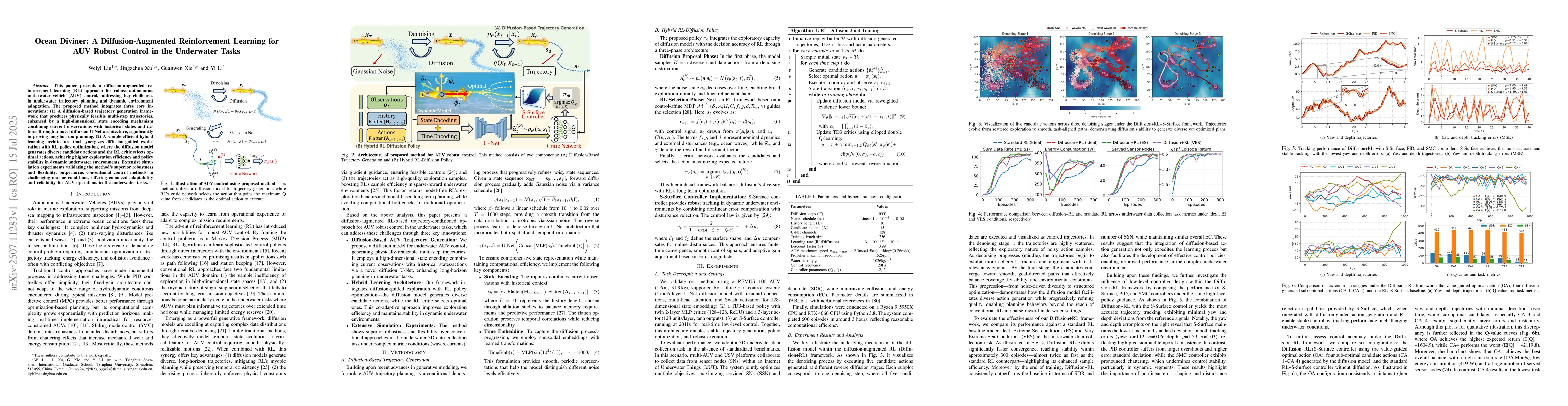 This paper presents a diffusion-augmented reinforcement learning (RL) approach for robust autonomous underwater vehicle (AUV) control, addressing key challenges in underwater trajectory planning and dynamic environment adaptation. The proposed method integrates three core innovations: (1) A diffusion-based trajectory generation framework that produces physically feasible multi-step trajectories, enhanced by a high-dimensional state encoding mechanism combining current observations with historical states and actions through a novel diffusion U-Net architecture, significantly improving long-horizon planning. (2) A sample-efficient hybrid learning architecture that synergizes diffusion-guided exploration with RL policy optimization, where the diffusion model generates diverse candidate actions and the RL critic selects optimal actions, achieving higher exploration efficiency and policy stability in dynamic underwater environments. Extensive simulation experiments validating the method's superior robustness and flexibility, outperforms conventional control methods in challenging marine conditions, offering enhanced adaptability and reliability for AUV operations in the underwater tasks.
