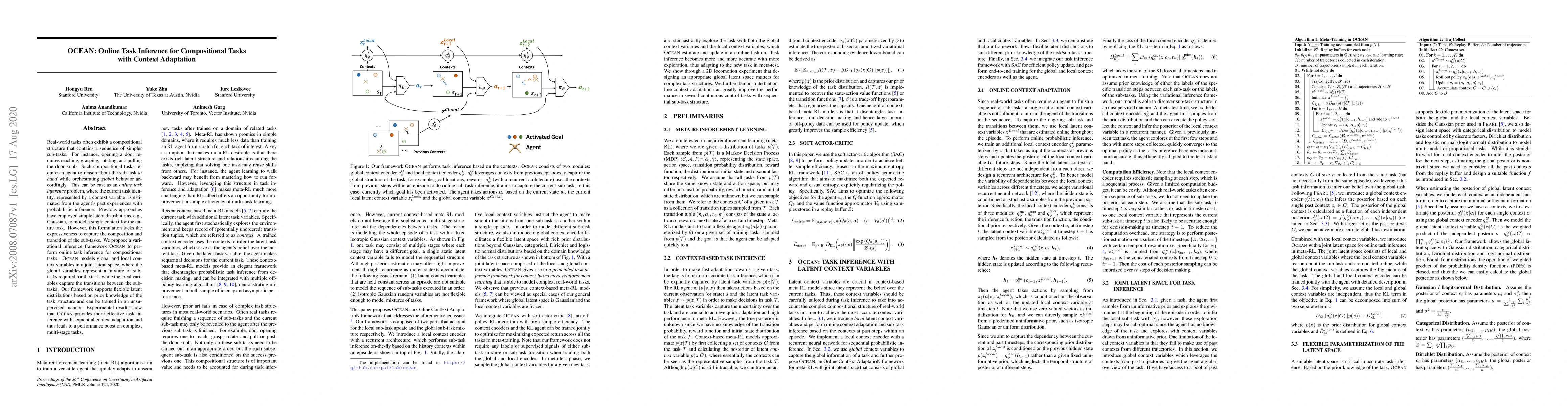 Real-world tasks often exhibit a compositional structure that contains a sequence of simpler sub-tasks. For instance, opening a door requires reaching, grasping, rotating, and pulling the door knob. Such compositional tasks require an agent to reason about the sub-task at hand while orchestrating global behavior accordingly. This can be cast as an online task inference problem, where the current task identity, represented by a context variable, is estimated from the agent's past experiences with probabilistic inference. Previous approaches have employed simple latent distributions, e.g., Gaussian, to model a single context for the entire task. However, this formulation lacks the expressiveness to capture the composition and transition of the sub-tasks. We propose a variational inference framework OCEAN to perform online task inference for compositional tasks. OCEAN models global and local context variables in a joint latent space, where the global variables represent a mixture of sub-tasks required for the task, while the local variables capture the transitions between the sub-tasks. Our framework supports flexible latent distributions based on prior knowledge of the task structure and can be trained in an unsupervised manner. Experimental results show that OCEAN provides more effective task inference with sequential context adaptation and thus leads to a performance boost on complex, multi-stage tasks.