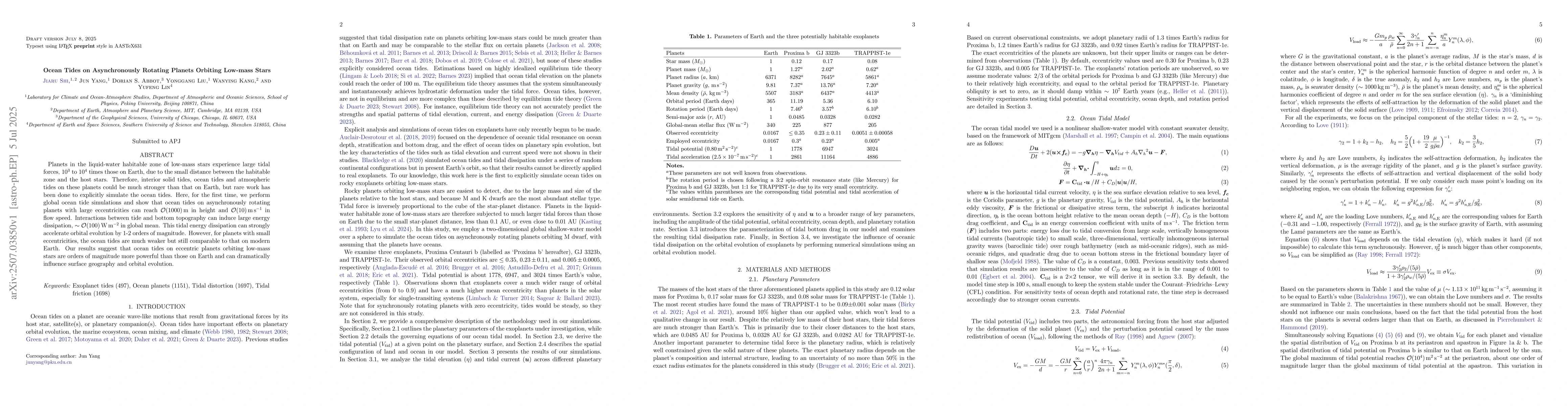 The study performs global ocean tide simulations on asynchronously rotating planets orbiting low-mass stars, using a modified version of MITgcm and EQTIDE for orbital evolution calculations.