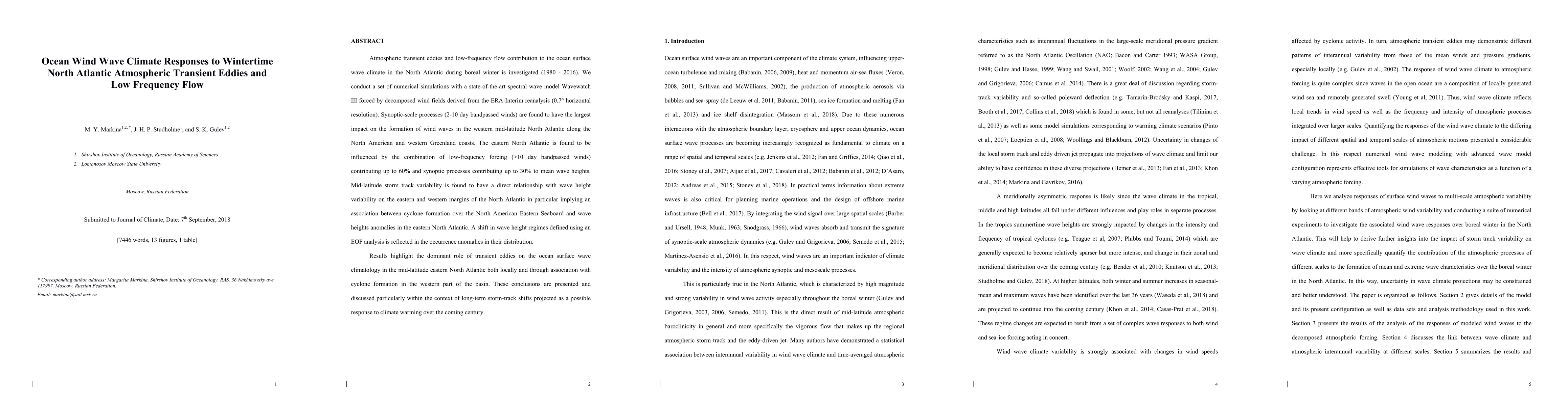 This study investigates the impact of atmospheric transient eddies and low-frequency flow on the North Atlantic ocean wind wave climate during winter. Numerical simulations reveal that synoptic-scale processes significantly affect wind waves in the western North Atlantic, while low-frequency winds contribute up to 60% to wave heights in the eastern region, highlighting the dominant role of transient eddies in the mid-latitude eastern North Atlantic wave climatology.