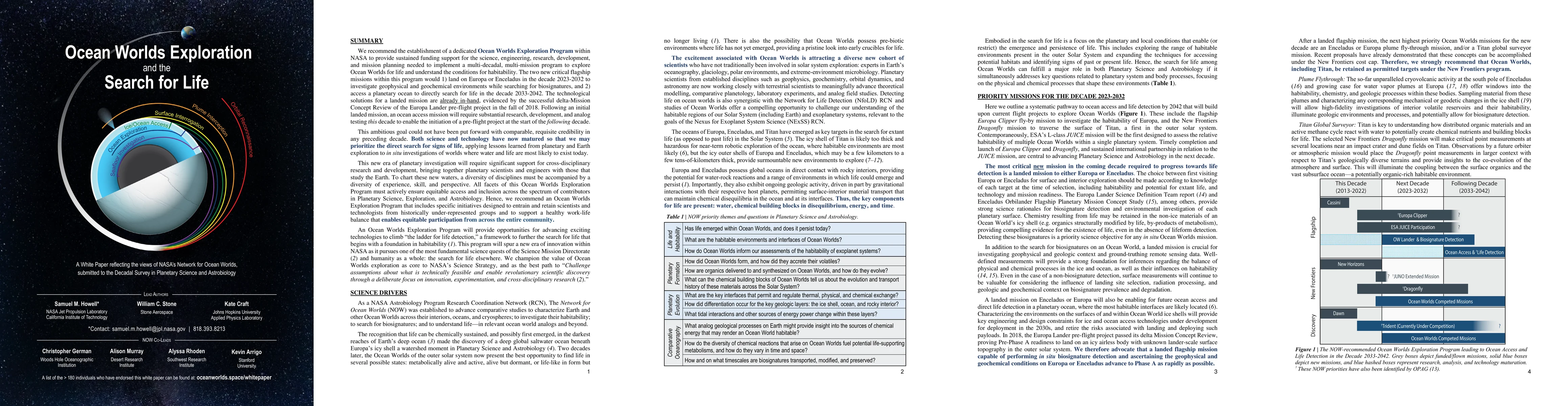 This white paper advocates for a dedicated NASA Ocean Worlds Exploration Program to fund a multi-mission initiative aimed at exploring icy moons like Europa and Enceladus for signs of life and habitability conditions. It proposes flagship missions to land on these moons and access their subsurface oceans in the coming decades.