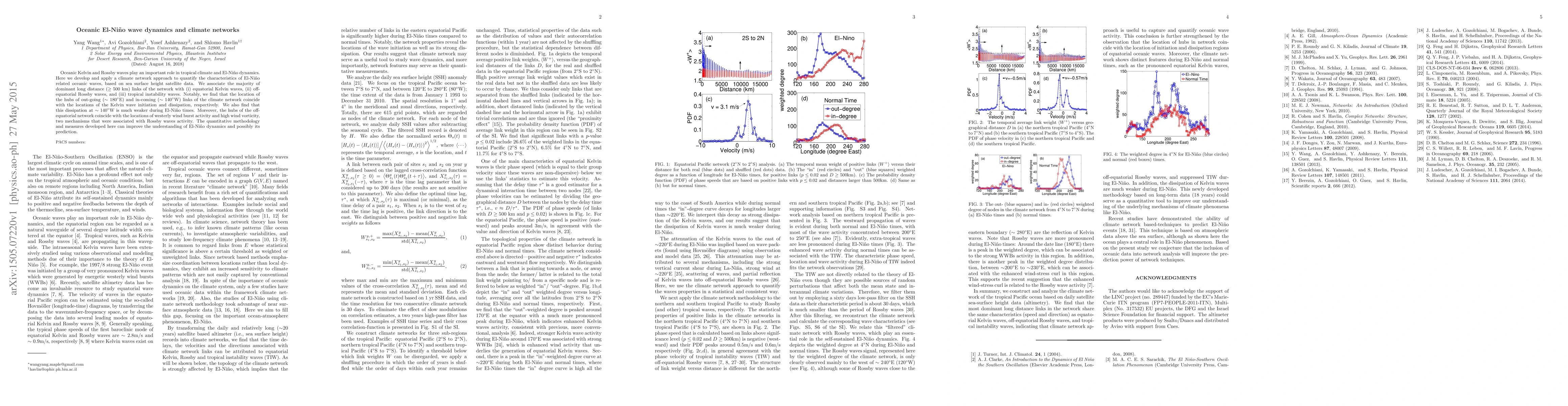 Oceanic Kelvin and Rossby waves play an important role in tropical climate and \en dynamics. Here we develop and apply a climate network approach to quantify the characteristics of \en related oceanic waves, based on sea surface height satellite data. We associate the majority of dominant long distance ($\geq 500$ km) links of the network with (i) equatorial Kelvin waves, (ii) off-equatorial Rossby waves, and (iii) tropical instability waves. Notably, we find that the location of the hubs of out-going ($\sim 180^{\circ}\rm{E}$) and in-coming ($\sim 140^{\circ}\rm{W}$) links of the climate network coincide with the locations of the Kelvin wave initiation and dissipation, respectively. We also find that this dissipation at $\sim 140^{\circ}\rm{W}$ is much weaker during \en times. Moreover, the hubs of the off-equatorial network coincide with the locations of westerly wind burst activity and high wind vorticity, two mechanisms that were associated with Rossby waves activity. The quantitative methodology and measures developed here can improve the understanding of \en dynamics and possibly its prediction.