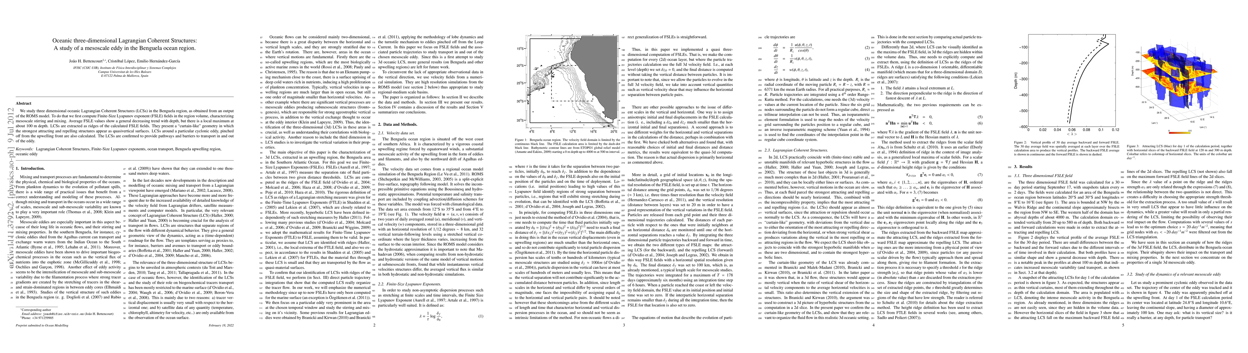 This study investigates three-dimensional Lagrangian Coherent Structures (LCSs) in the Benguela ocean region using the ROMS model, identifying LCSs as ridges in the Finite-Size Lyapunov exponent (FSLE) fields. The LCSs around a cyclonic eddy exhibit a "curtain-like" geometry, acting as pathways and barriers for transport.