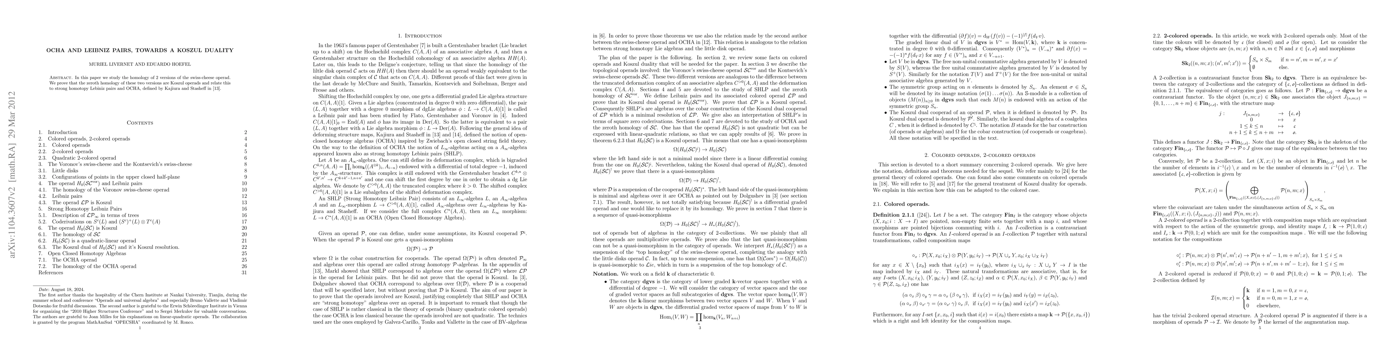 In this paper we study the homology of 2 versions of the swiss-cheese operad. We prove that the zeroth homology of these two versions are Koszul operads and relate this to strong homotopy Lebiniz pairs and OCHA, defined by Kajiura and Stasheff.