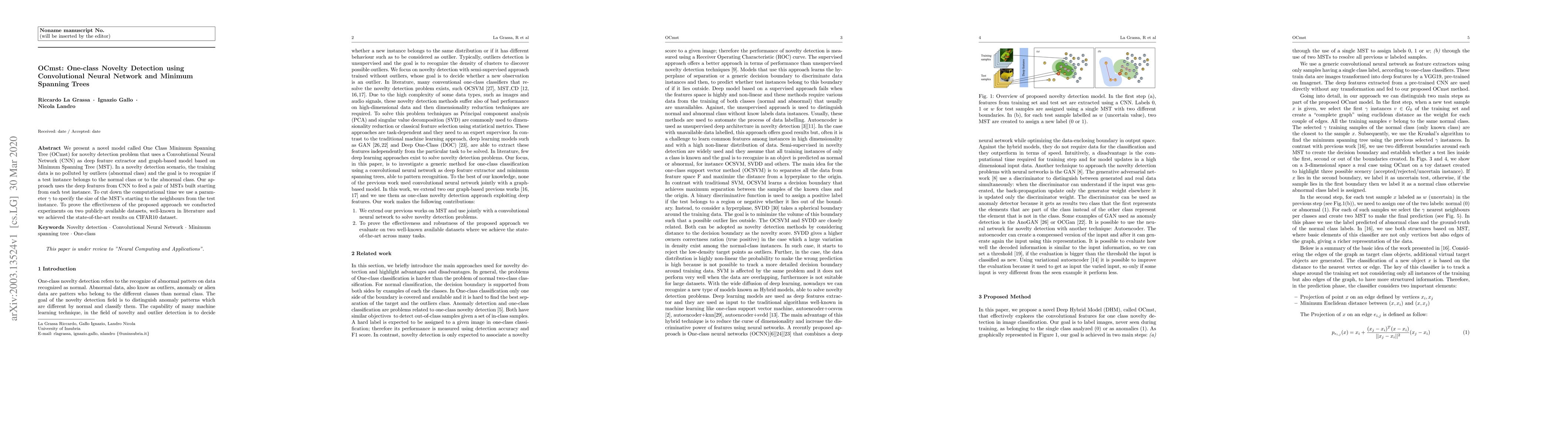 We present a novel model called One Class Minimum Spanning Tree (OCmst) for novelty detection problem that uses a Convolutional Neural Network (CNN) as deep feature extractor and graph-based model based on Minimum Spanning Tree (MST). In a novelty detection scenario, the training data is no polluted by outliers (abnormal class) and the goal is to recognize if a test instance belongs to the normal class or to the abnormal class. Our approach uses the deep features from CNN to feed a pair of MSTs built starting from each test instance. To cut down the computational time we use a parameter $\gamma$ to specify the size of the MST's starting to the neighbours from the test instance. To prove the effectiveness of the proposed approach we conducted experiments on two publicly available datasets, well-known in literature and we achieved the state-of-the-art results on CIFAR10 dataset.