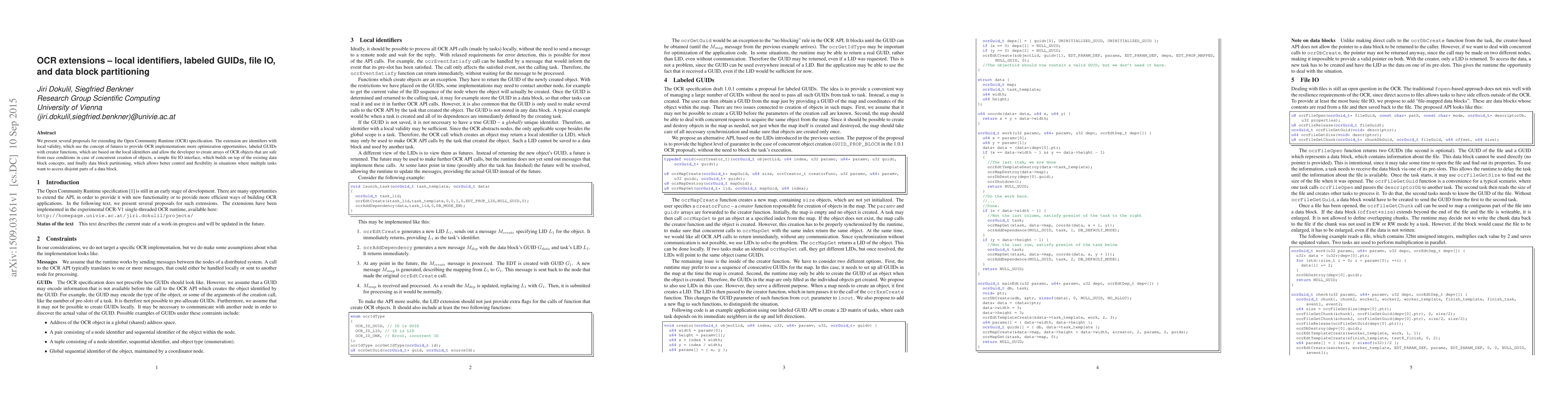 This paper proposes four extensions to the Open Community Runtime (OCR) specification: local identifiers, labeled GUIDs with creator functions, file IO interface, and data block partitioning for improved performance and control.