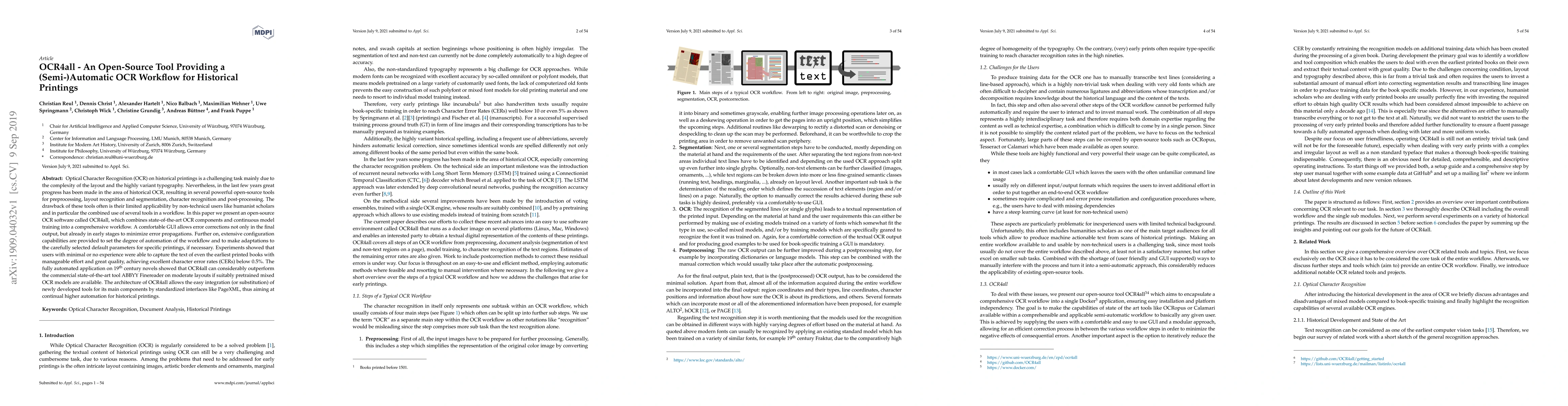 A new open-source OCR tool called OCR4all provides a semi-automatic workflow for historical printings, achieving high-quality character recognition with minimal user expertise, and aims to improve automation through its modular architecture.
