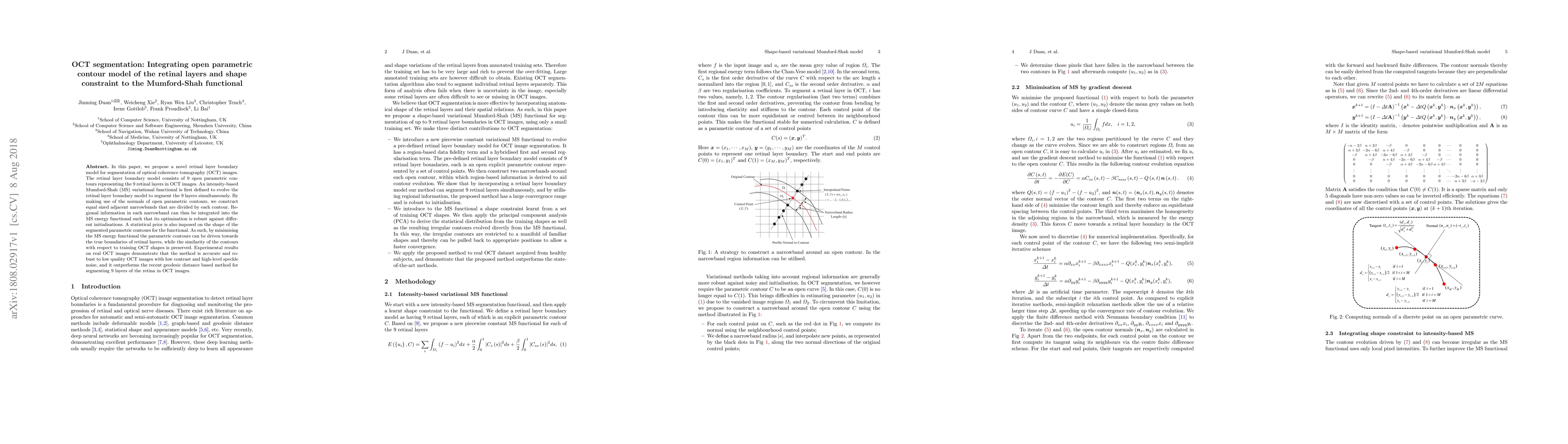 In this paper, we propose a novel retinal layer boundary model for segmentation of optical coherence tomography (OCT) images. The retinal layer boundary model consists of 9 open parametric contours representing the 9 retinal layers in OCT images. An intensity-based Mumford-Shah (MS) variational functional is first defined to evolve the retinal layer boundary model to segment the 9 layers simultaneously. By making use of the normals of open parametric contours, we construct equal sized adjacent narrowbands that are divided by each contour. Regional information in each narrowband can thus be integrated into the MS energy functional such that its optimisation is robust against different initialisations. A statistical prior is also imposed on the shape of the segmented parametric contours for the functional. As such, by minimising the MS energy functional the parametric contours can be driven towards the true boundaries of retinal layers, while the similarity of the contours with respect to training OCT shapes is preserved. Experimental results on real OCT images demonstrate that the method is accurate and robust to low quality OCT images with low contrast and high-level speckle noise, and it outperforms the recent geodesic distance based method for segmenting 9 layers of the retina in OCT images.