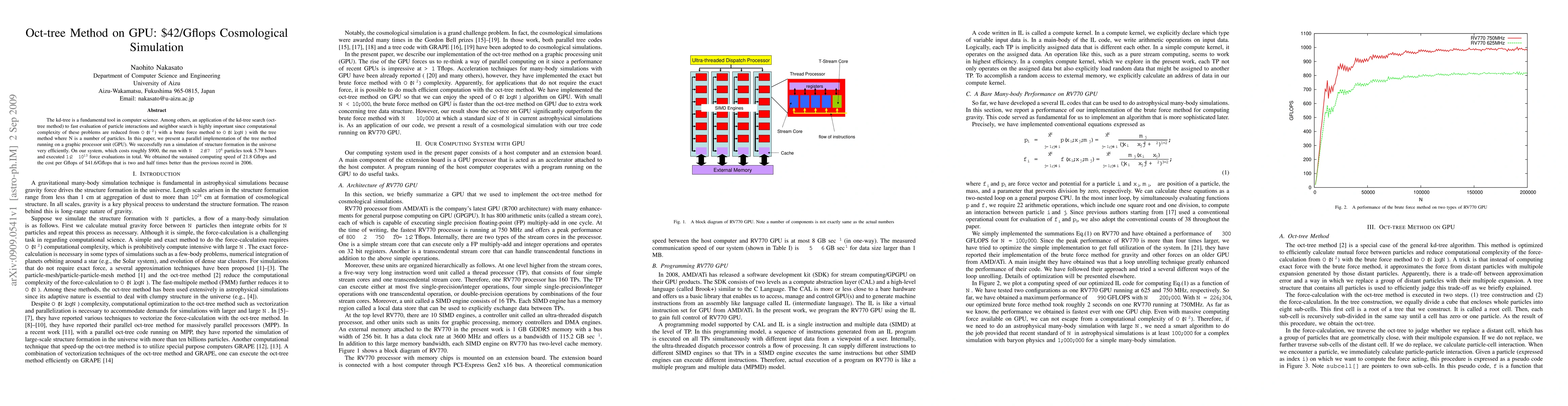 This paper presents a parallel implementation of the oct-tree method on a GPU to efficiently evaluate particle interactions, reducing computational complexity from O(N^2) to O(N log N). The GPU-based simulation achieved a sustained computing speed of 21.8 Gflops, significantly outperforming previous records.