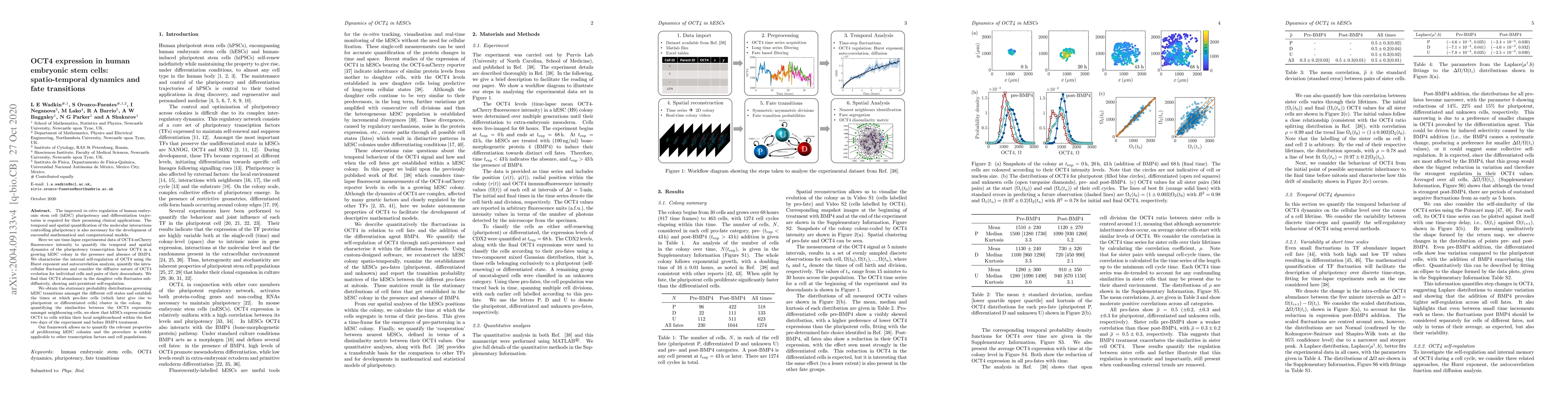 This study quantifies the spatio-temporal dynamics of OCT4 expression in human embryonic stem cells (hESC) using time-lapse fluorescence data, revealing sub-diffusive fluctuations and anti-persistent self-regulation. The findings provide insights into the internal self-regulation of OCT4 and the clustering of pro-fate cells, aiding in the development of mathematical models for hESC pluripotency and differentiation.