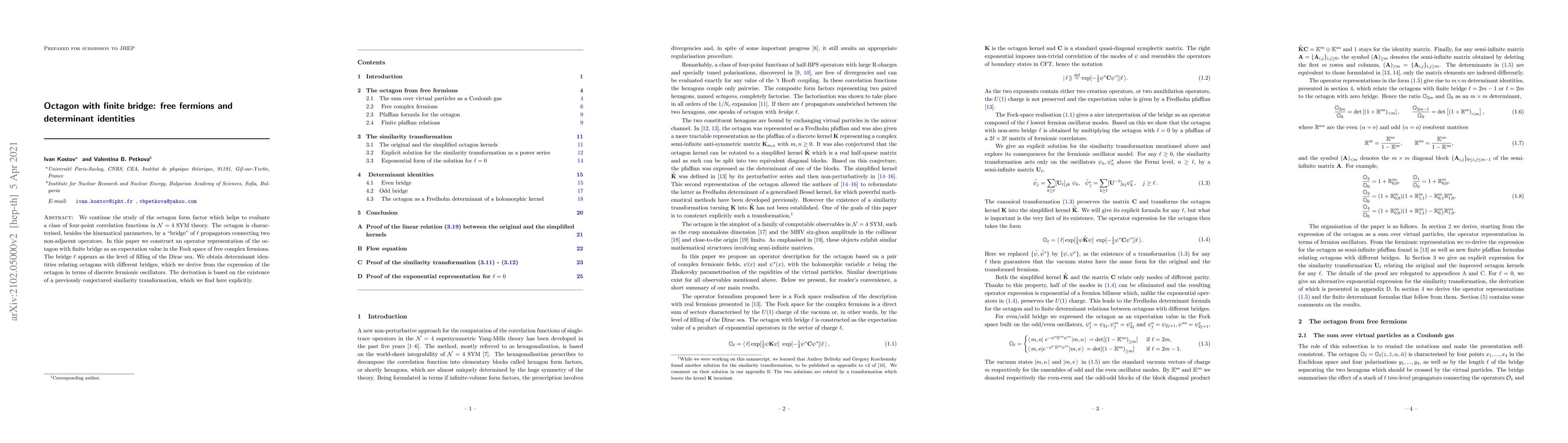 We continue the study of the octagon form factor which helps to evaluate a class of four-point correlation functions in $\mathcal{N}=4$ SYM theory. The octagon is characterised, besides the kinematical parameters, by a "bridge" of $\ell$ propagators connecting two non-adjacent operators. In this paper we construct an operator representation of the octagon with finite bridge as an expectation value in the Fock space of free complex fermions. The bridge $\ell$ appears as the level of filling of the Dirac sea. We obtain determinant identities relating octagons with different bridges, which we derive from the expression of the octagon in terms of discrete fermionic oscillators. The derivation is based on the existence of a previously conjectured similarity transformation, which we find here explicitly.