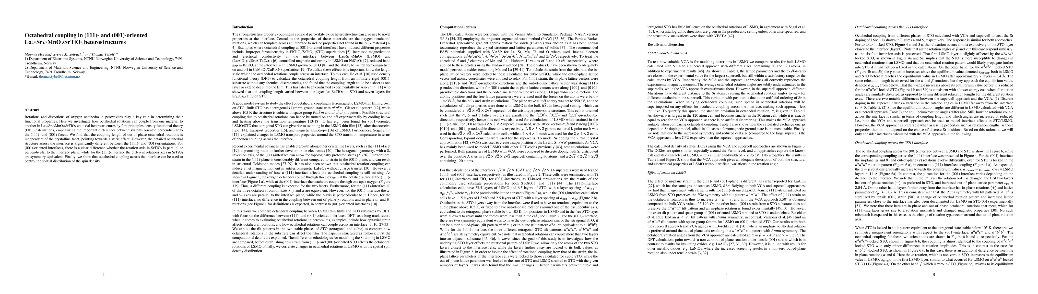 This work distinguishes itself by emphasizing the differences in octahedral coupling between (111)- and (001)-oriented interfaces and demonstrating the control of spin density distribution via octahedral coupling, highlighting the significance of geometrical lattice engineering.